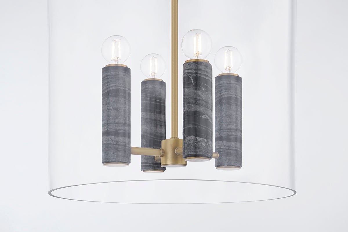 Adonis takes a familiar lantern silhouette and combines it with a unique and upscale mix of materials to make it stand out and feel special. A clear glass cylindrical shade houses a set of honed Nero Madera Marble candlesticks with Vintage Brass accents for a refreshing yet refined look that complements any interior. Style alone or in multiples.