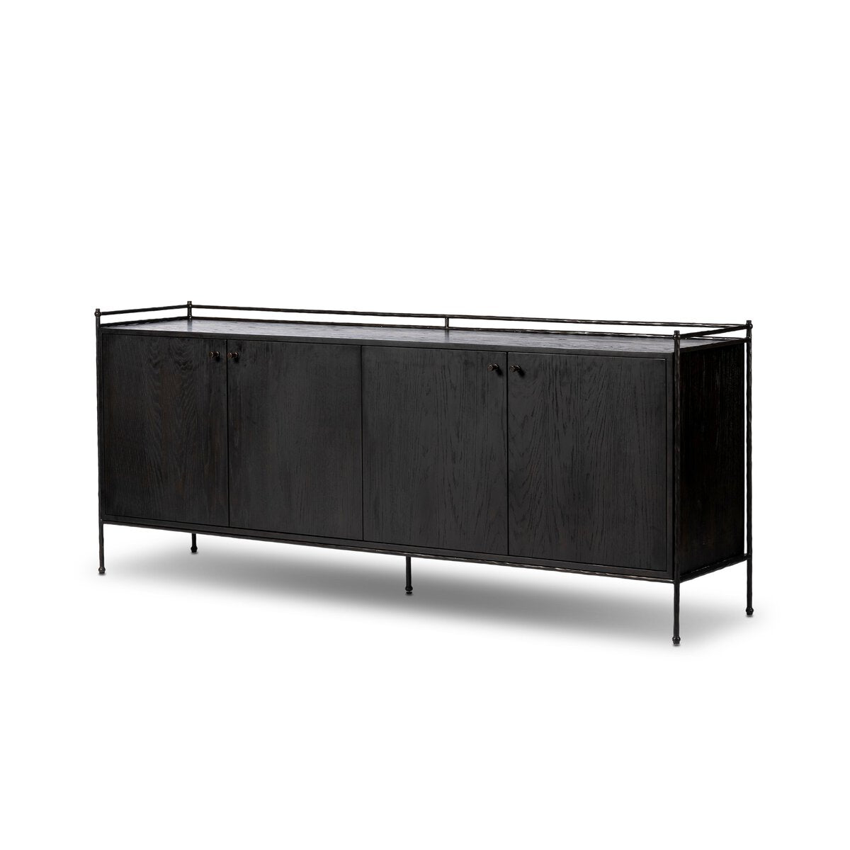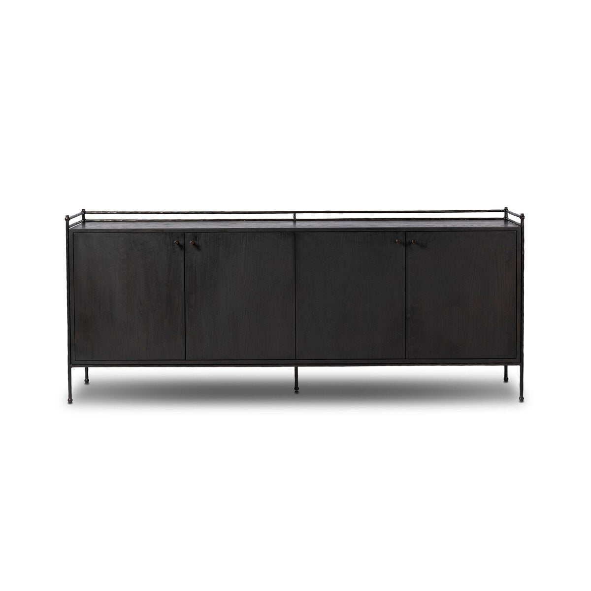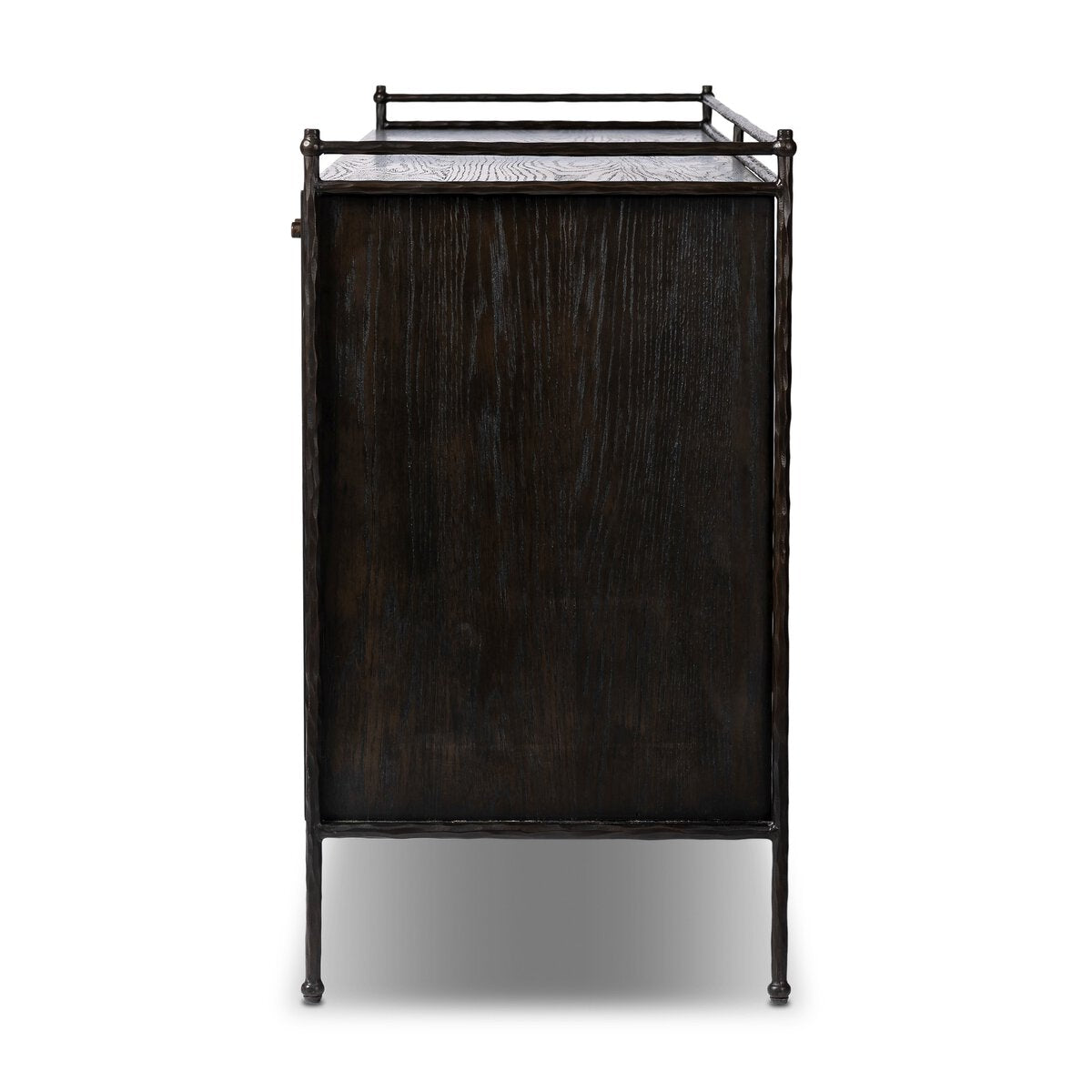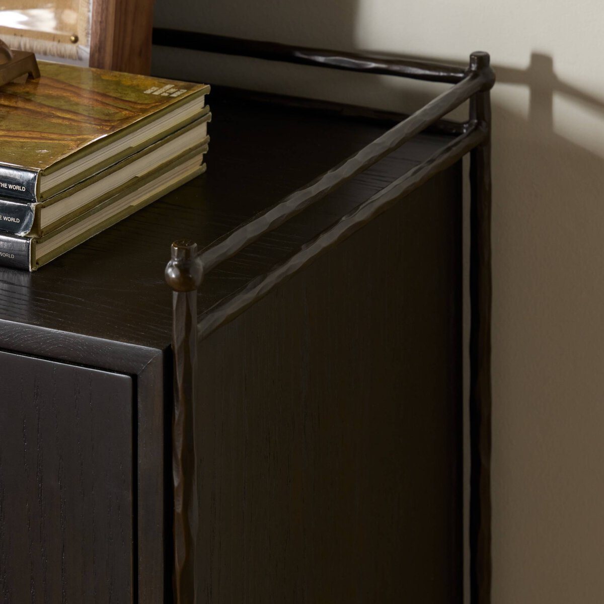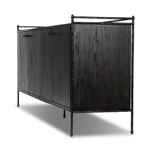 Hammered metal frame details add industrial appeal to a charcoal-finished oak sideboard. Minimalist hardware in matching bronze.