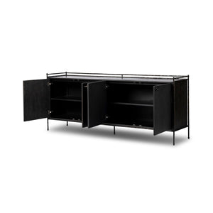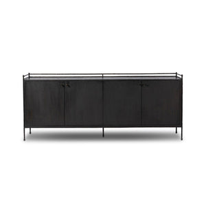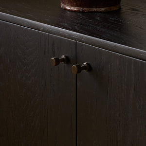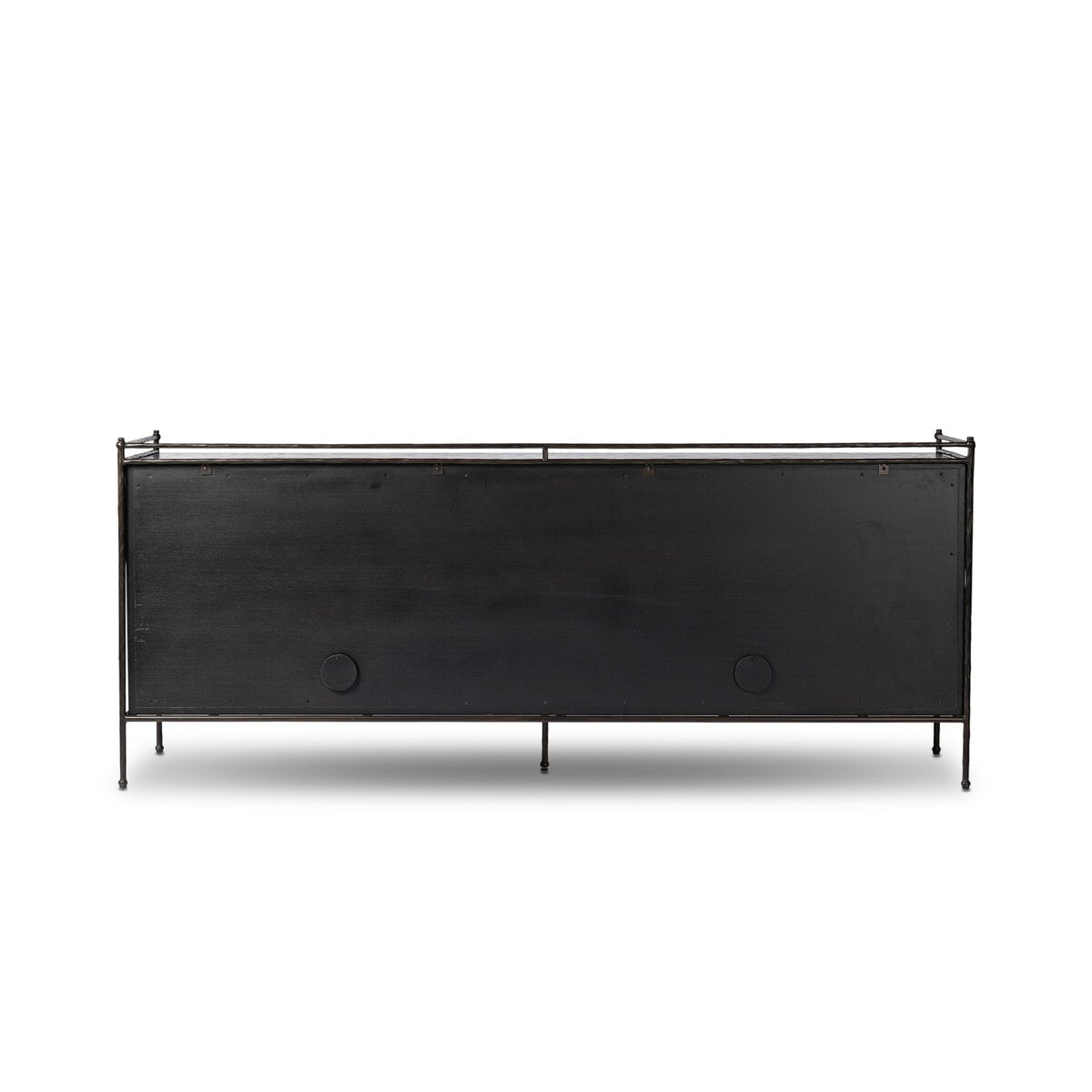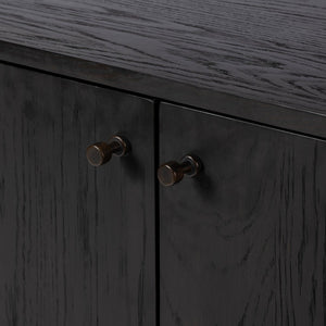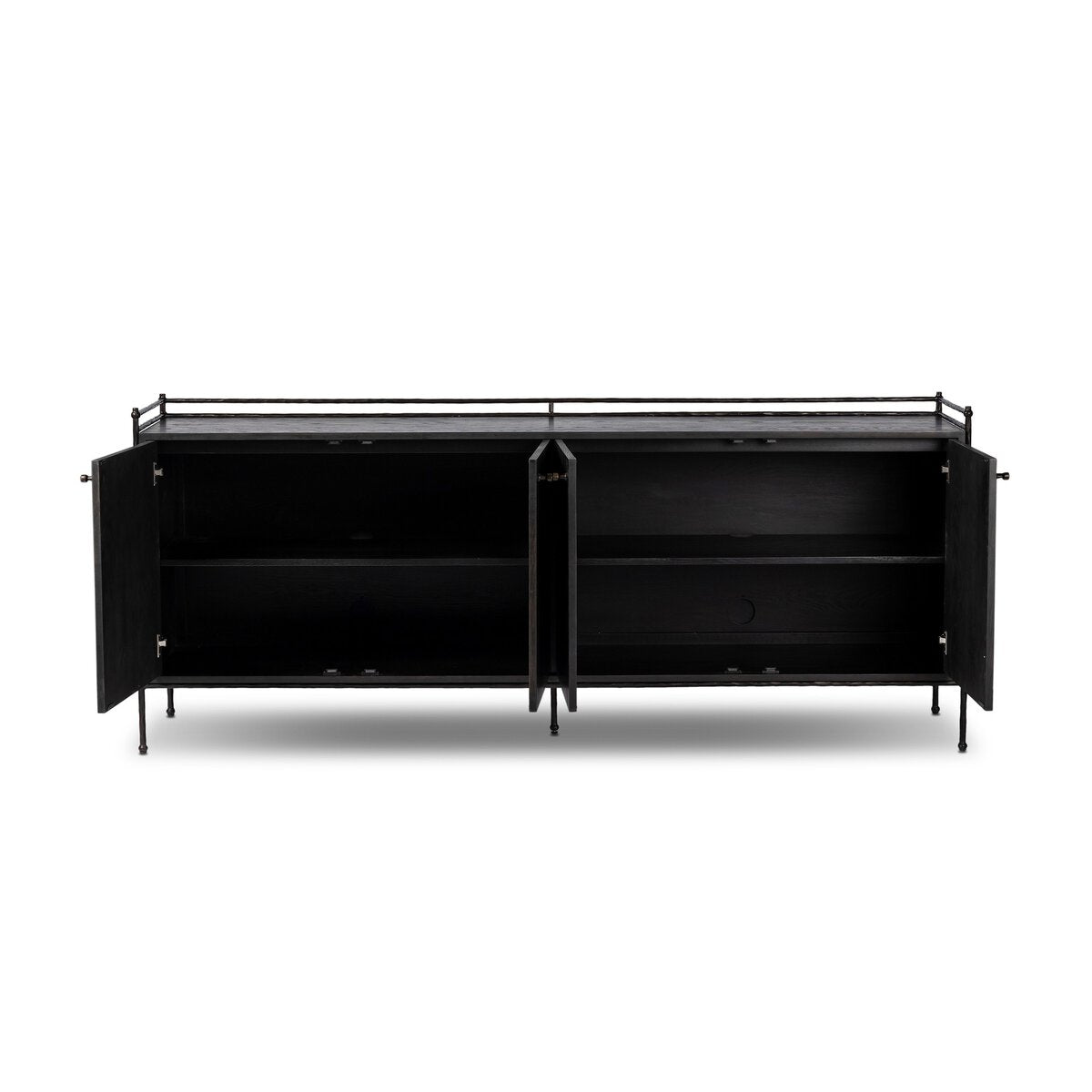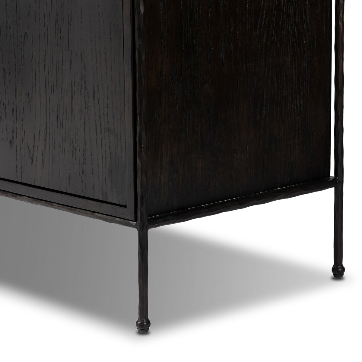 Hammered metal frame details add industrial appeal to a charcoal-finished oak sideboard. Minimalist hardware in matching bronze.