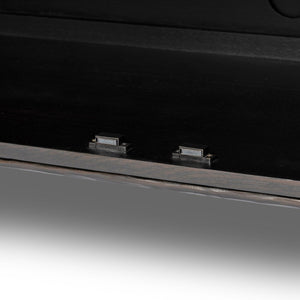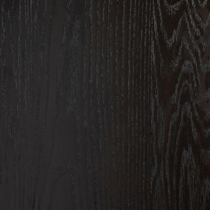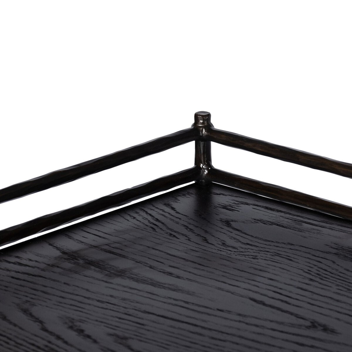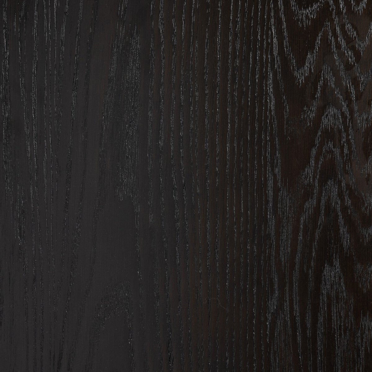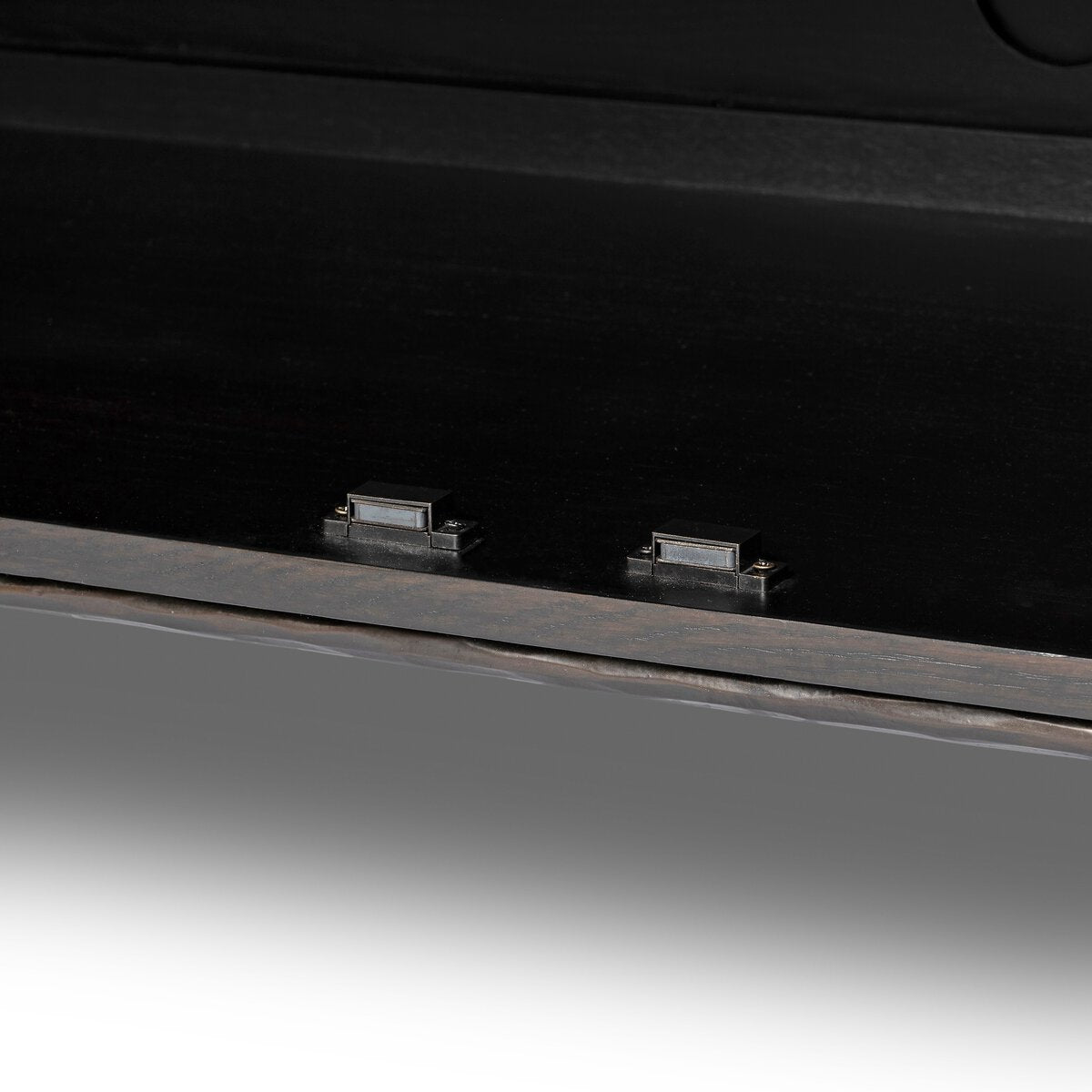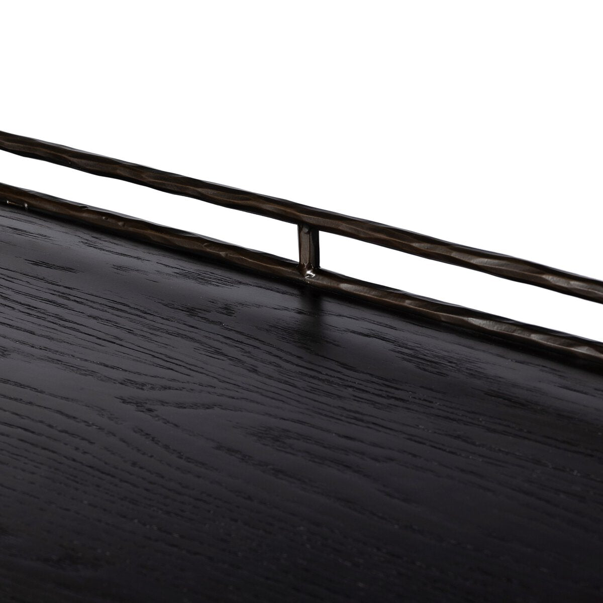Hammered metal frame details add industrial appeal to a charcoal-finished oak sideboard. Minimalist hardware in matching bronze.