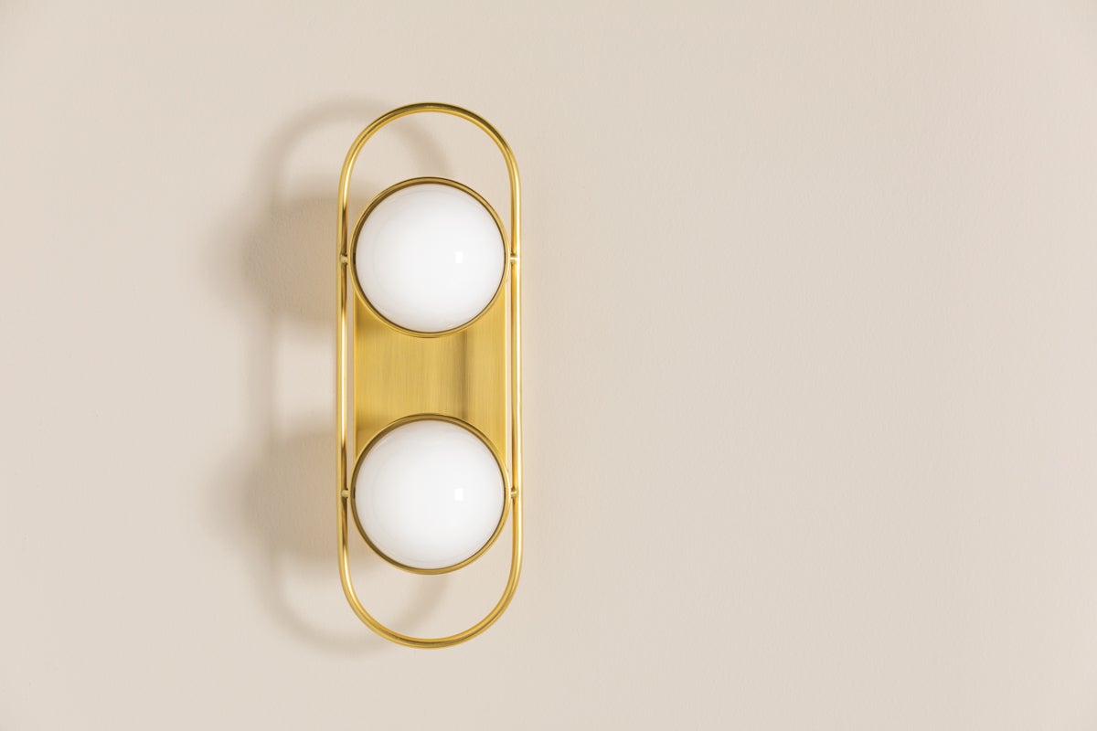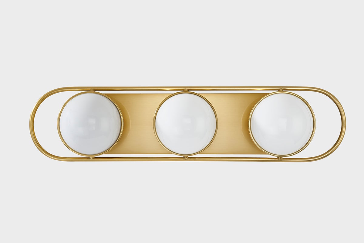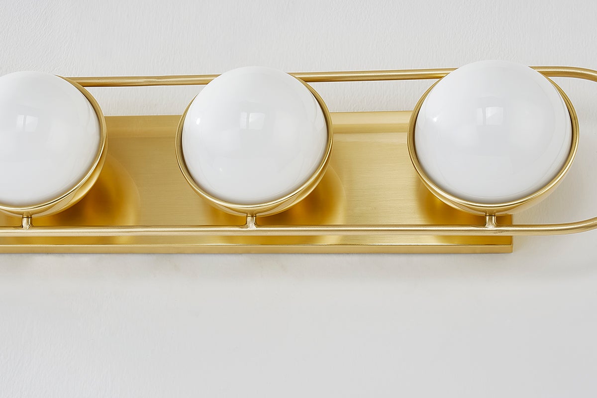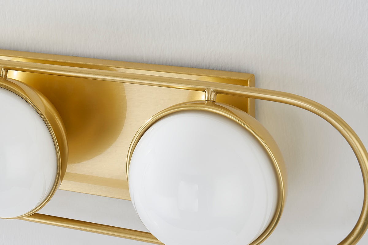 Opal glass spheres are held gem-like within a Polished Nickel or Aged Brass setting, bringing a modern jewelry aesthetic to the bath or powder room. The two-, three-, and four-light options are displayed within an elegant metal racetrack frame and can be mounted vertically or horizontally making them perfect solo above a mirror or in pairs alongside it.
