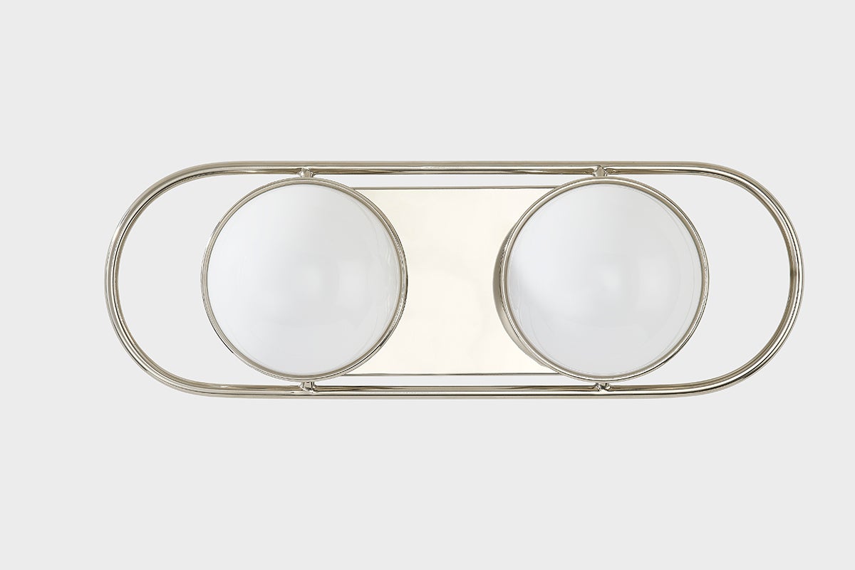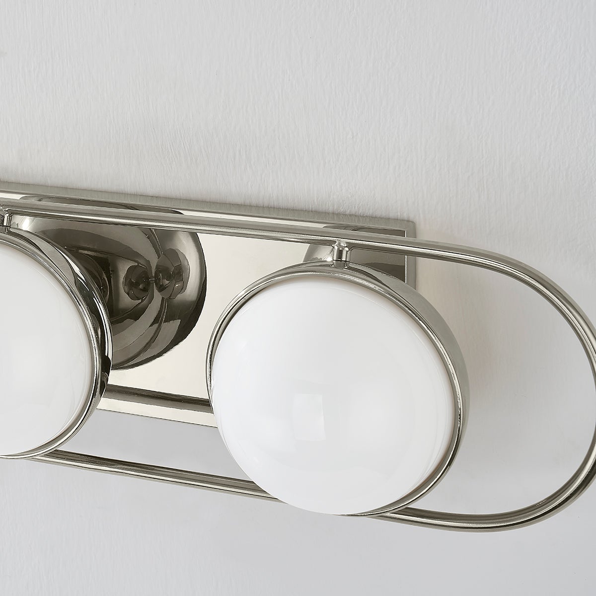 Opal glass spheres are held gem-like within a Polished Nickel or Aged Brass setting, bringing a modern jewelry aesthetic to the bath or powder room. The two-, three-, and four-light options are displayed within an elegant metal racetrack frame and can be mounted vertically or horizontally making them perfect solo above a mirror or in pairs alongside it.
