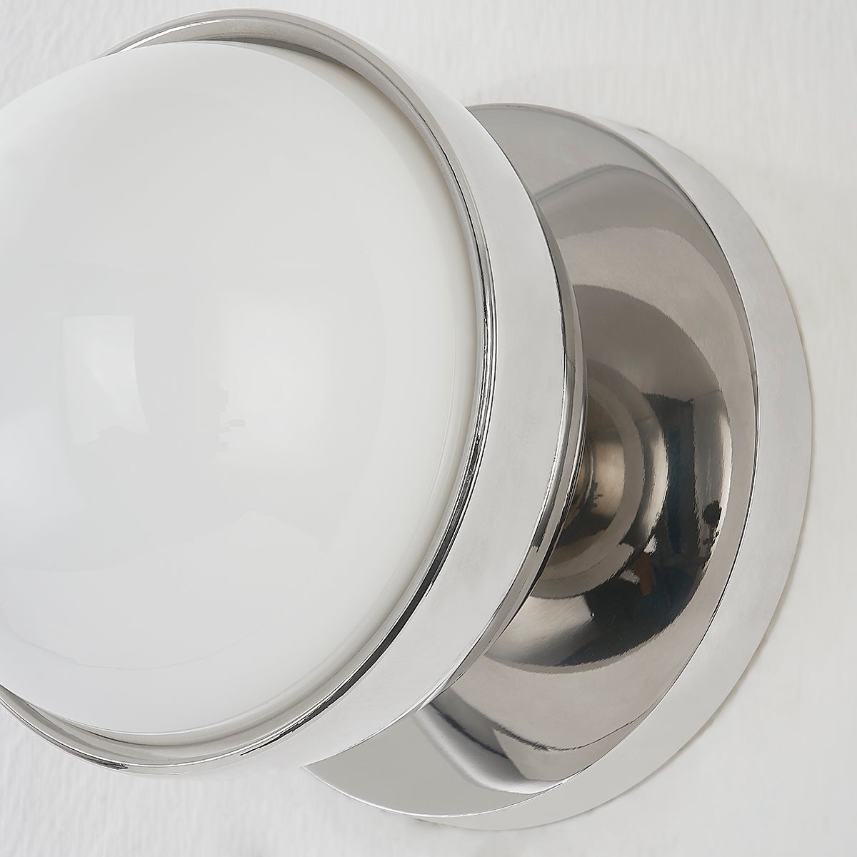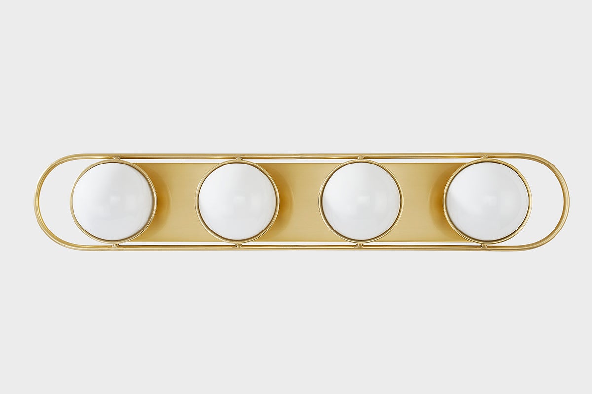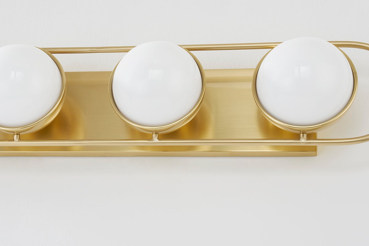 Opal glass spheres are held gem-like within a Polished Nickel or Aged Brass setting, bringing a modern jewelry aesthetic to the bath or powder room. The two-, three-, and four-light options are displayed within an elegant metal racetrack frame and can be mounted vertically or horizontally making them perfect solo above a mirror or in pairs alongside it.