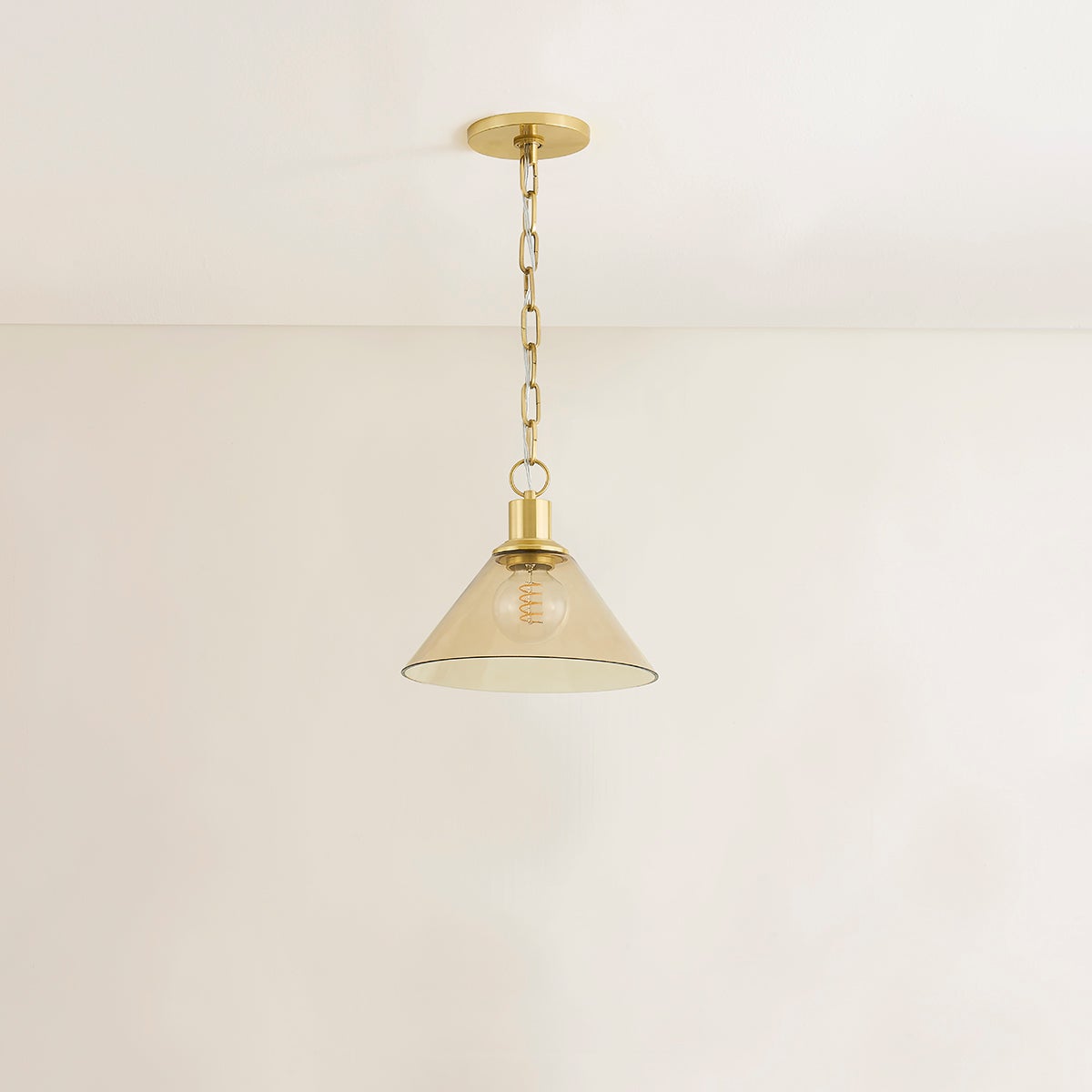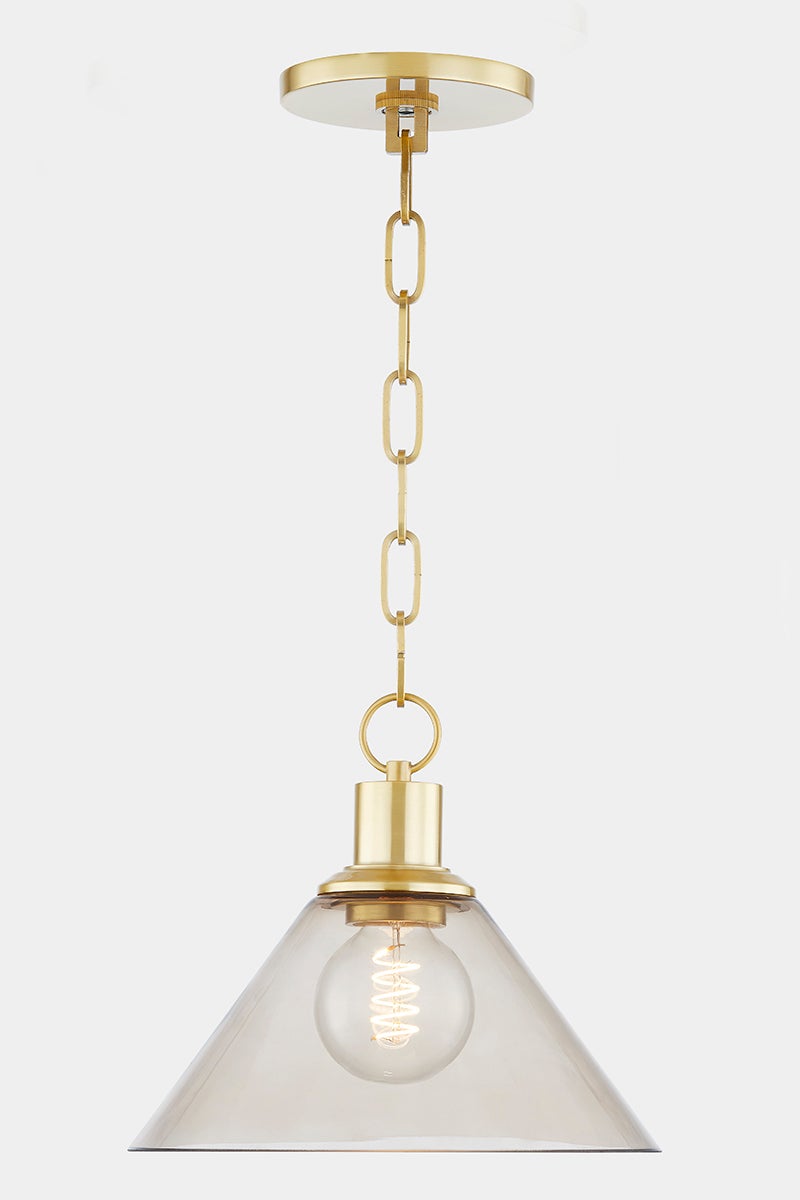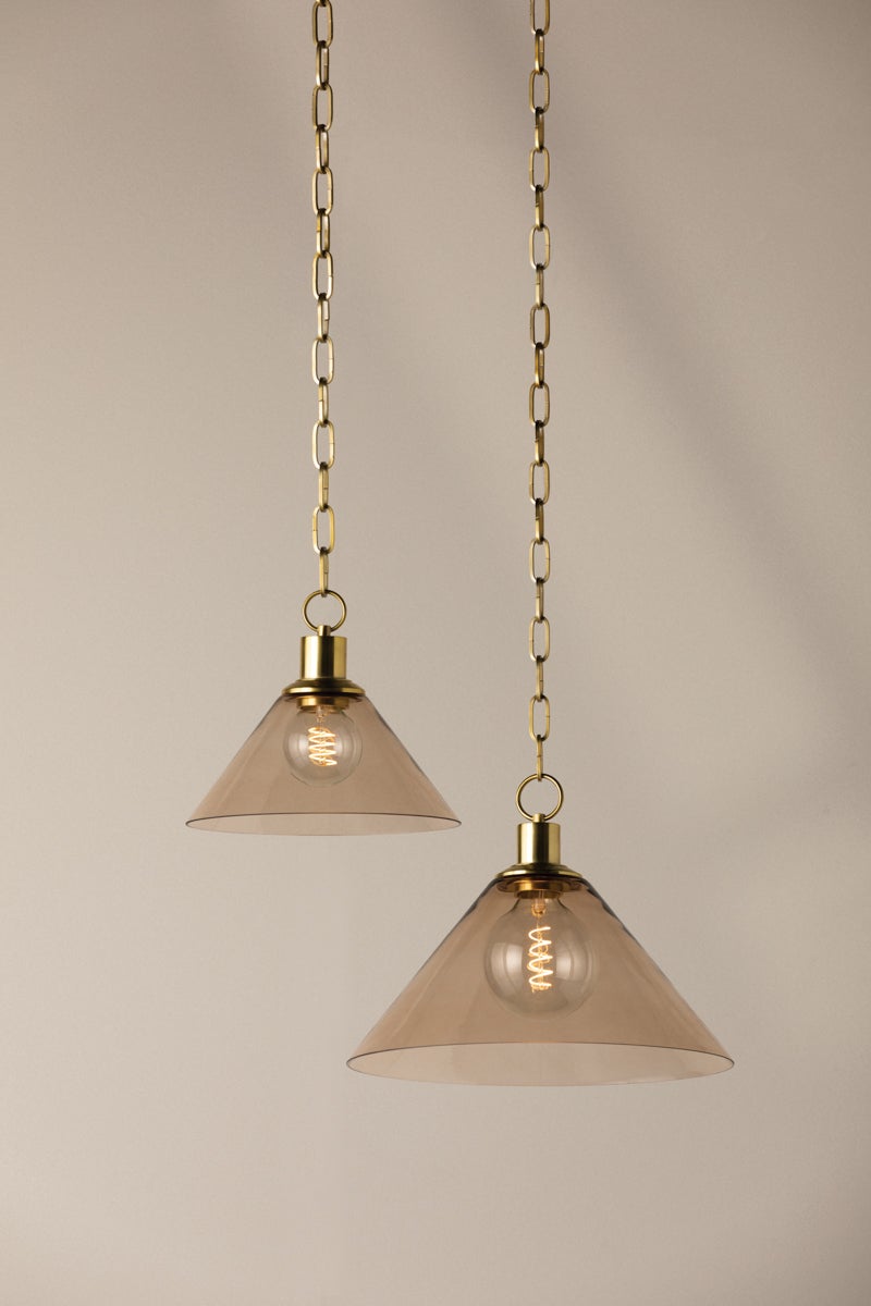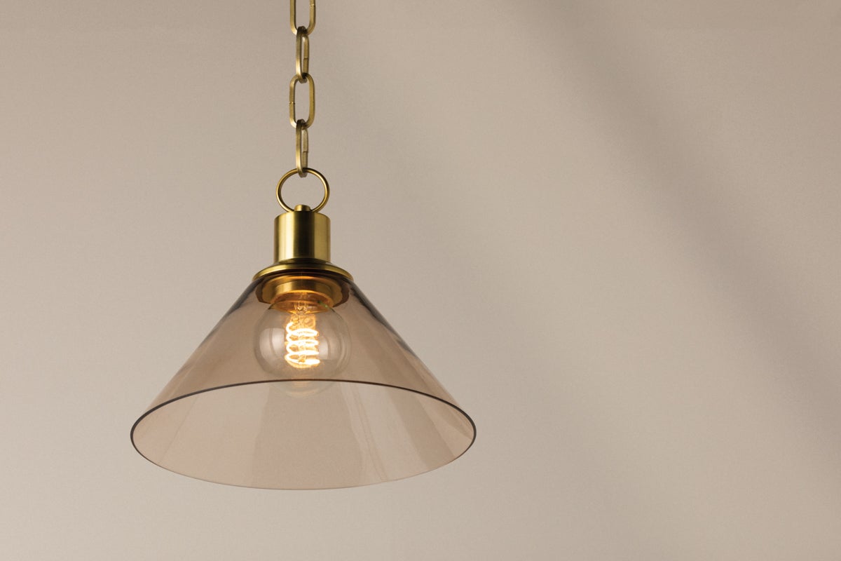 In the spirit of dusk, this serene pendant sets the mood for intimate conversations. The dusty rose-colored glass and Aged Brass cap and chain evoke a vintage feel, while the sharply tapered shade feels sleek and contemporary. In either of the two available sizes, it is an irresistible addition to your home or hallway. Part of THELIFESTYLEDCO® collection.