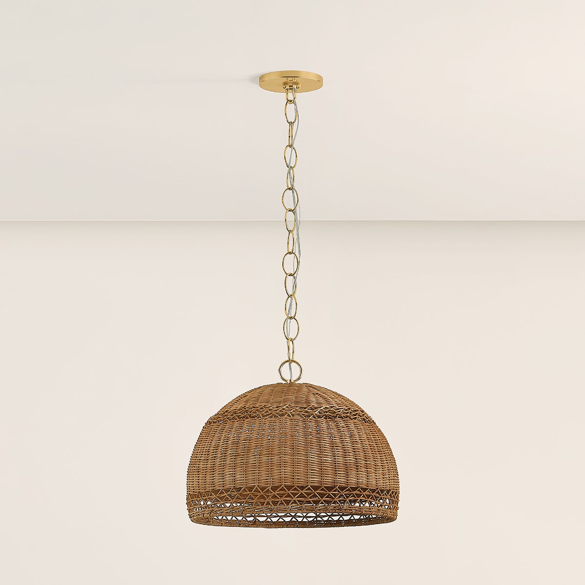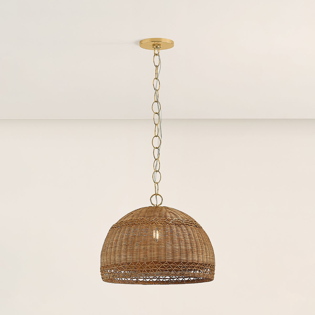 Leaning into vintage basketry techniques, the large wicker shade of the April pendant is unique, yet relatable. The shade is broken up into sections by two horizontal areas of open weave, allowing light to spill out. A classic chain suspends the fixture, adding a note of refinement to the woven naturals.