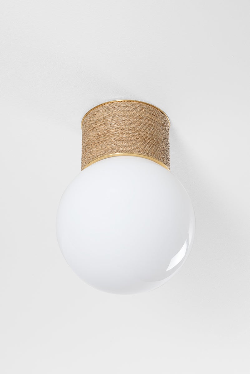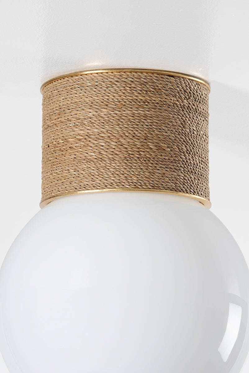 Modern meets rustic in this nautical-inspired flush mount. A testament to craftsmanship, the mount is hand-wrapped in natural Abaca rope, creating an organic, coastal effect. Ideal for a hallway or small living space, the extra-large opal glossy bulb provides soft, milky illumination. The glimmer of a Vintage Gold Leaf frame elevates the fixture with a decorative finish.
