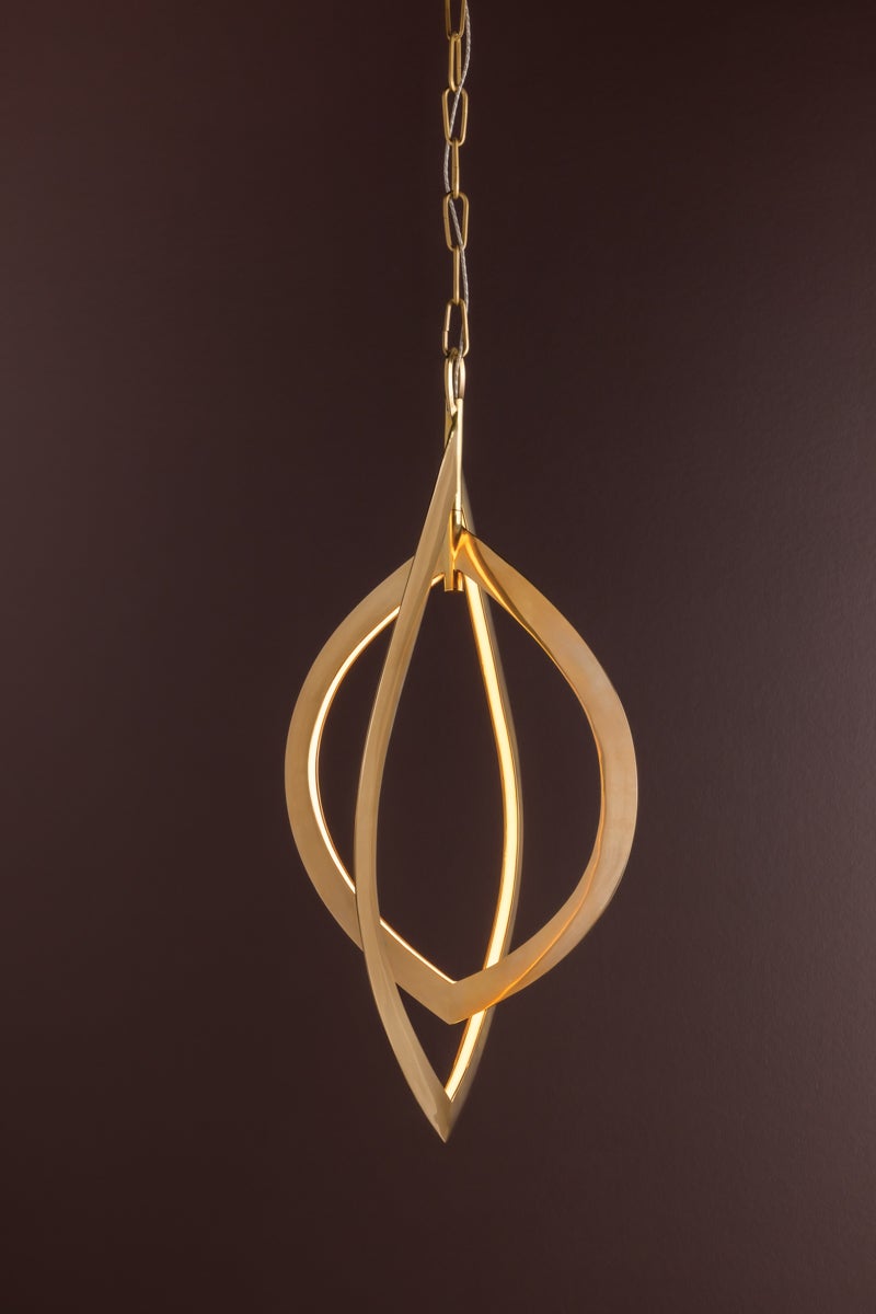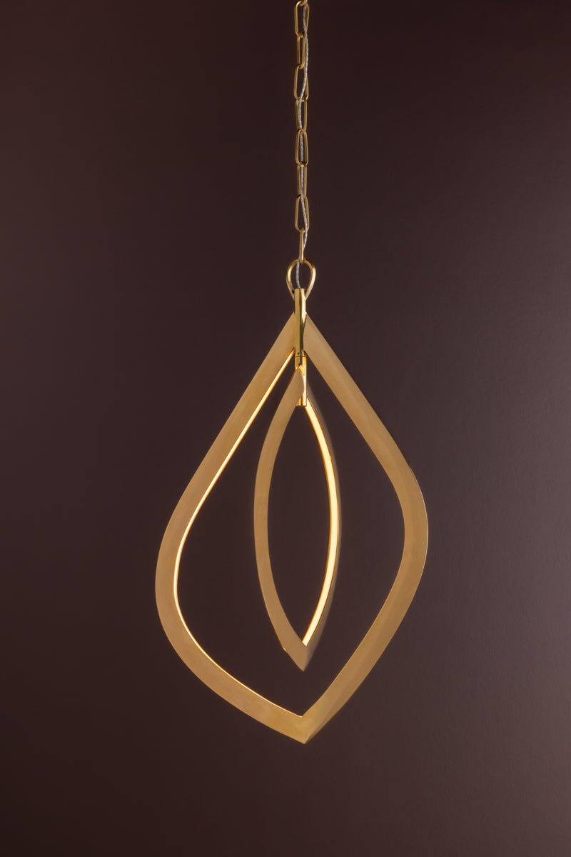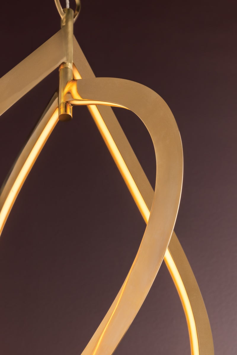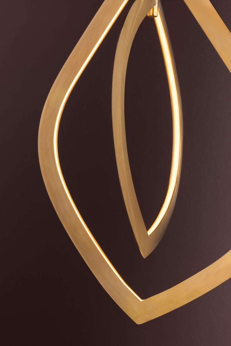 The natural world meets the precision of modern technology in the Arles chandelier. The silhouette is organic and fluid with curving metalwork reminiscent of jewelry. Within the two sculptural rings, thin LED bands emit a gentle glow. Available in two sizes and finished in Vintage Brass, Arles blurs the line between art and design.