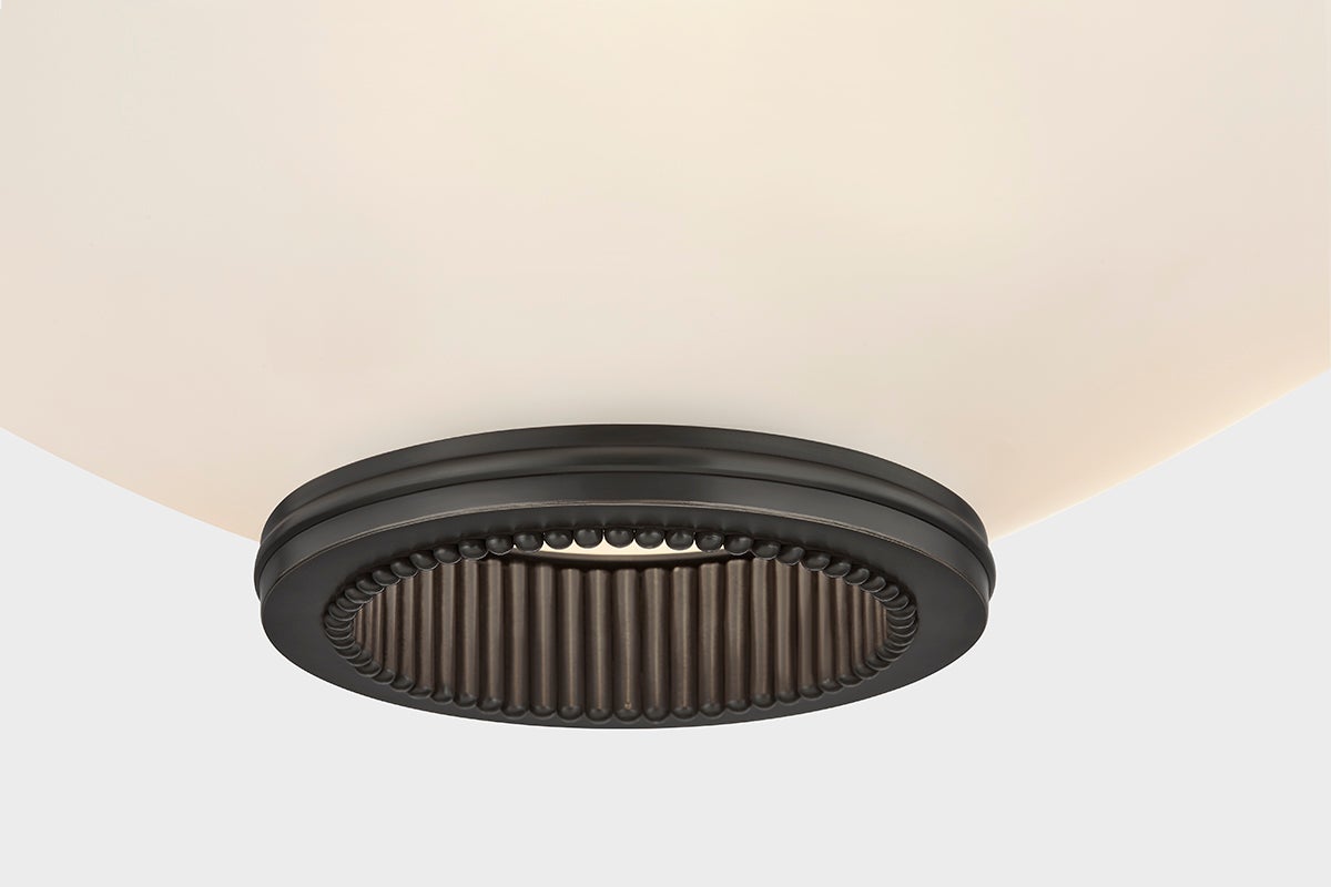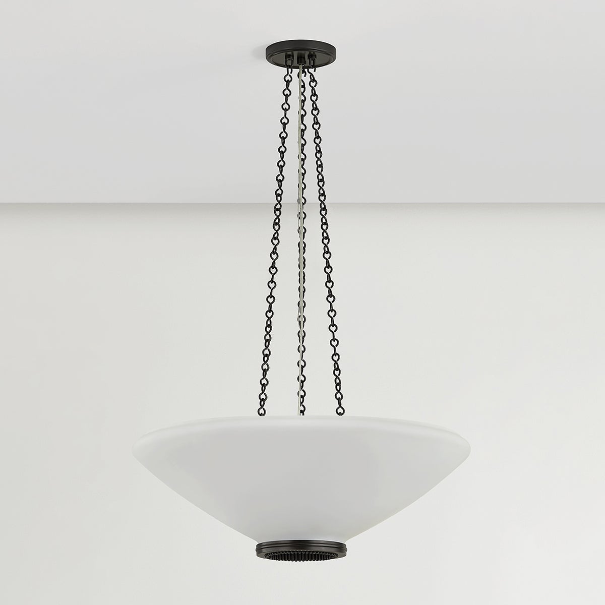 The traditional silhouette of the Awosting pendant receives a fashionable update with jewelry-inspired details. Blown from opal matte glass, the shade’s softened edges evoke a sense of calm, organic beauty. As light passes through the oculus, the lace-like metalwork becomes more noticeable. At the top, a trio of delicate vintage-inspired chains supports the shade. Awosting is available in two sizes and two finishes, Aged Brass and Dark Bronze.