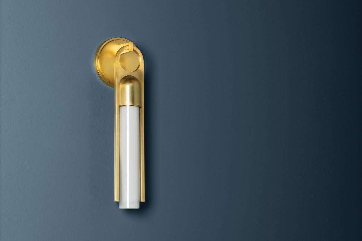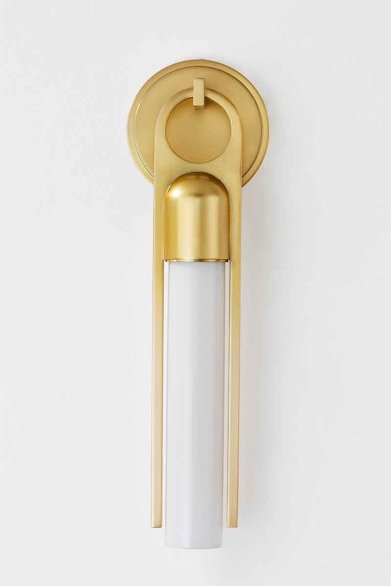 The sleek, unique silhouette of this sconce features a slender opal glossy glass shade wrapped in Aged or Black Brass and hooked to the round backplate by a loop, creating the illusion that the fixture is floating in front of the wall. Hardware-inspired, this refined modern sconce has a slight industrial vibe.