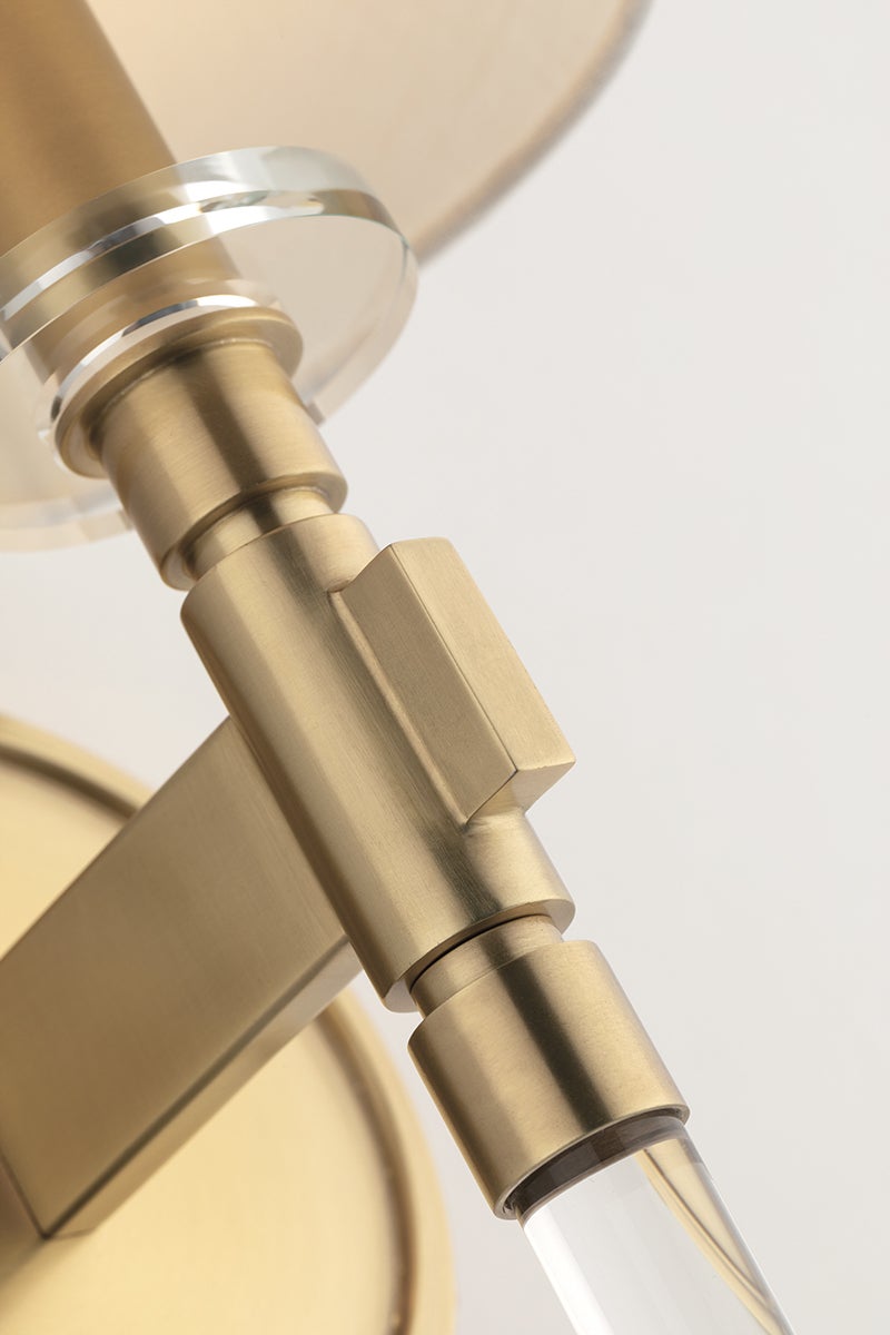 A beautiful mixture of materials enhances everyday interiors with our Blixen family. An off-white linen shade rests atop a long-tail crystal arm. Die-cast metal with stepped tooling connects the intersecting backplate and arms. A decorative crystal bobeche adds a thoughtful accent.