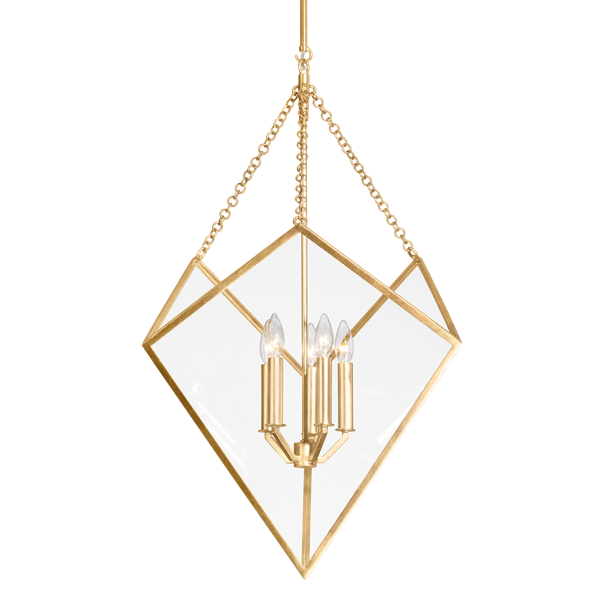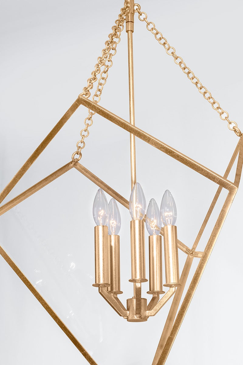 Playing with shape, angles, and negative space, Brookfield takes a classic lantern form and gives it a fresh look with a vintage feel. Sharp lines combine to create a gorgeous diamond-shaped framework with clear glass panels. The delicate chainwork enhances the design's jewelry-like vibe. Whether with a single exposed bulb in the center or a five-light candelabra, this unique pendant makes a stunning statement.