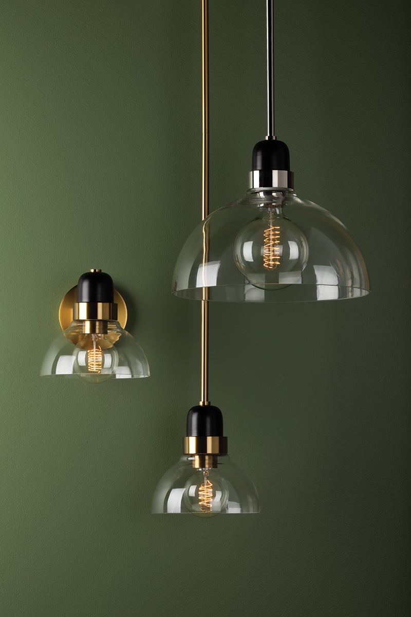 A modern industrial muse, Camile draws inspiration from the classic bistro light. Contemporary accents like the open, exaggerated shade allow light to flow freely, giving the piece a natural mystique. A soft black finish is accompanied by aged brass or polished nickel, providing a two-tone effect that is offset by hand-blown glass.
