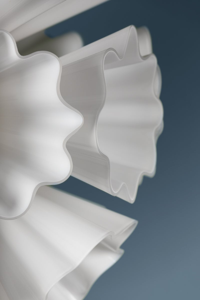 Capri is a beautifully botanical take on the sputnik silhouette. Wavy, floral-like shades of opal glossy glass sprout from a center orb to give the piece a natural, ruffled effect. This large-scale chandelier fills the entire space with a warm, tranquil glow.