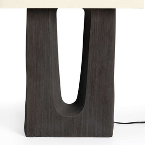 Inspired by a midcentury modern vase spotted at an antique fair just outside of Austin. Base and finial on top are crafted of ceramic in a textured matte black finish. Topped with a rectangle polyester/linen shade.