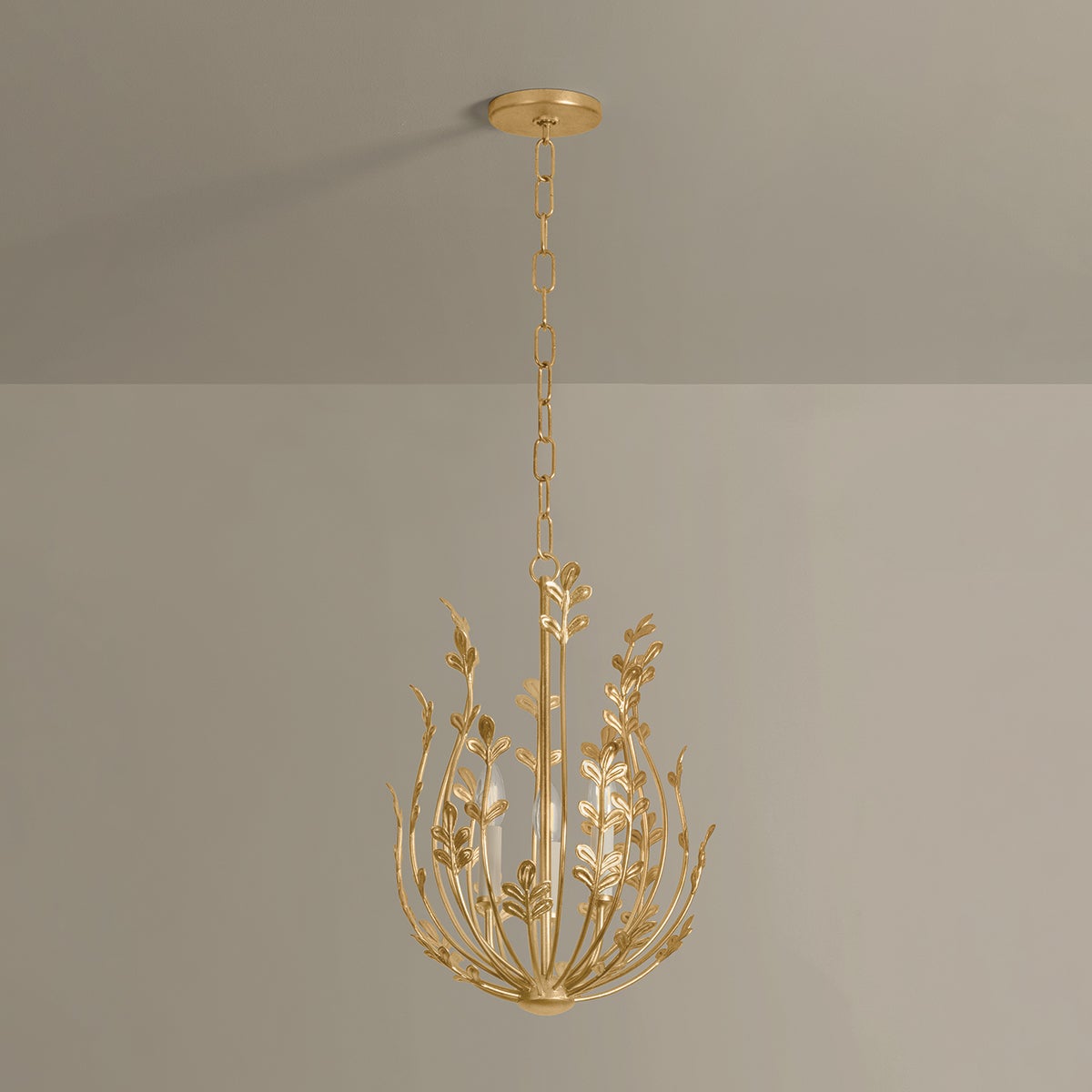 Somewhere between the concept of a pendant and a lantern floats the ethereal, botanically-inspired Delmore. Made of iron and finished in Vintage Gold Leaf, the airy frame features sprightly curving stems accented by etched leaf details. 3 or 6 candles are nested within the delicate composition, creating a bright and joyous celebration of nature.