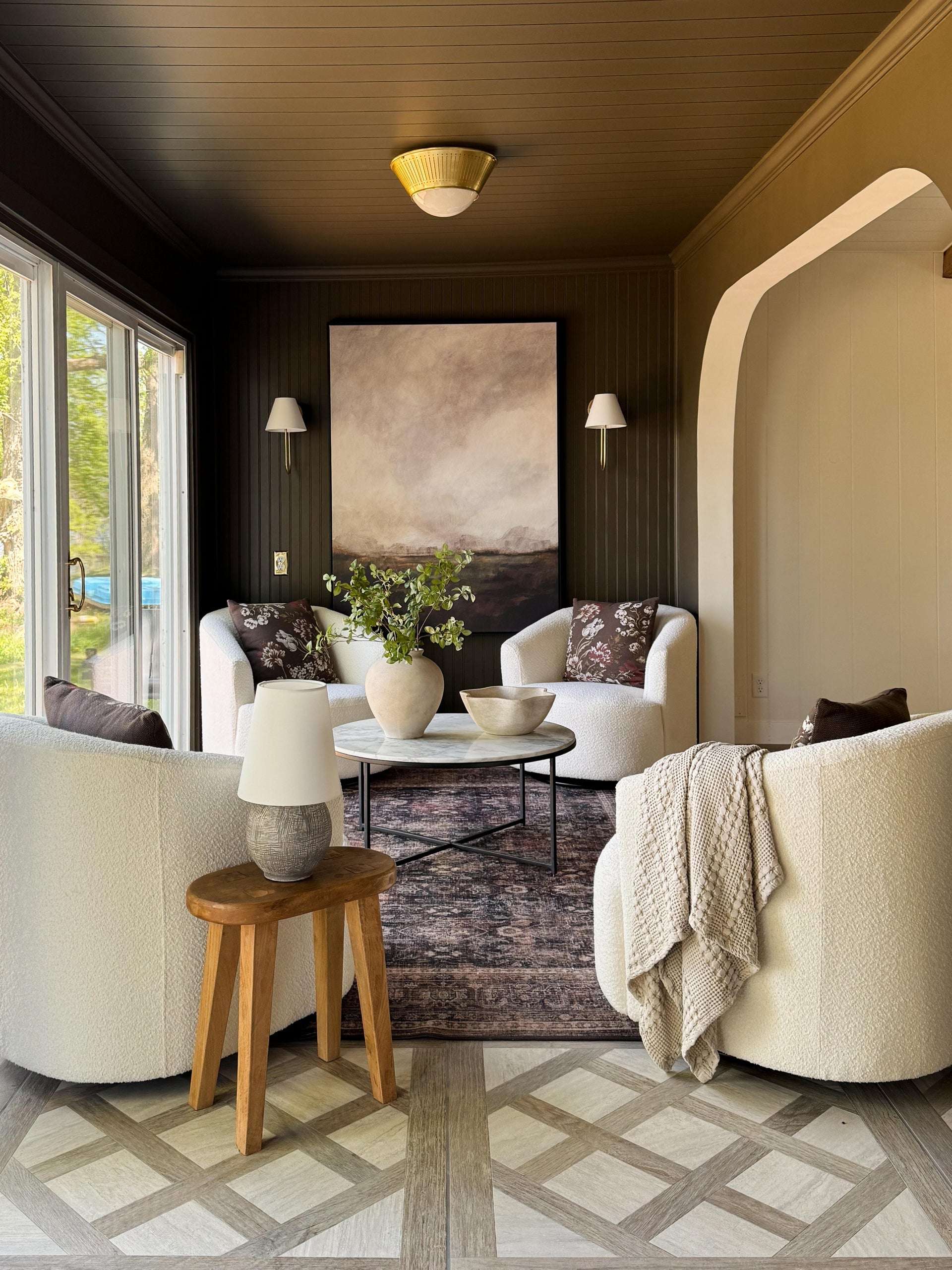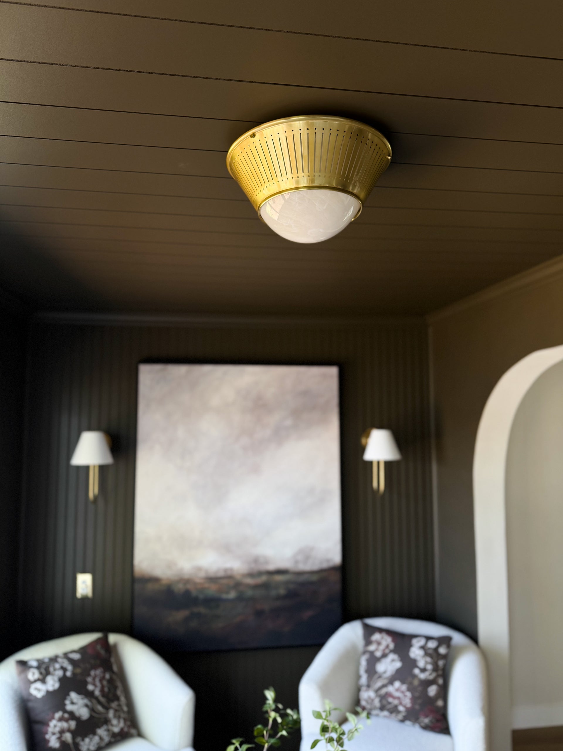 Inspired by the architecture of the Art Deco period, Elsmere makes the case for replacing can lights with a more elevated ceiling fixture. This beautiful flush mount is finished in Aged Brass with decorative perforations that allow light to escape. Even with the metalwork's edge, the rounded cloud glass shade forms a sun-like visual, with the perforations mimicking rays of light.