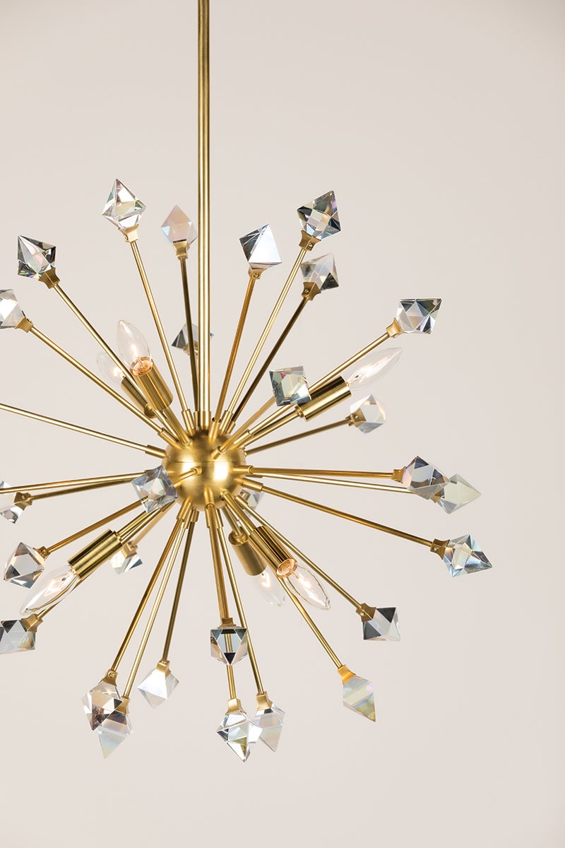 A Mid-century marvel, the sputnik style has captivated design fiends for decades. Genesis reimagines this icon, bringing celestial glamour in starburst form. Dancing between each light source are iridescent crystals, creating prisms of light throughout the room. Finished in aged brass, the Genesis Wall Sconce, Flush Mount, and Chandelier is the statement-making piece you need.