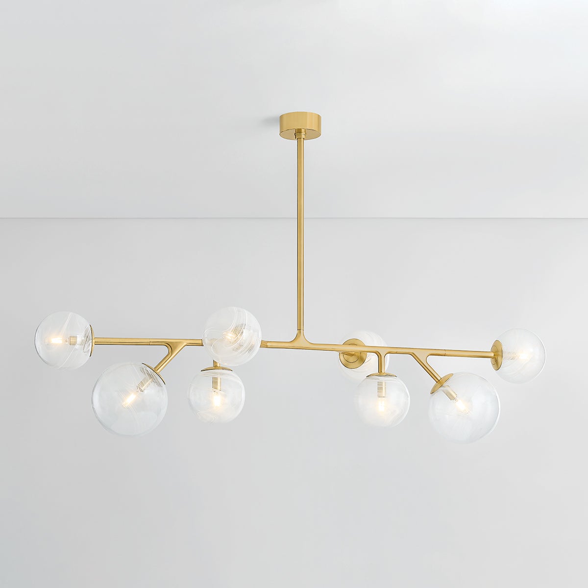 The Glasgow family of chandeliers and linears captures the old-meets-new vibrancy of its namesake Scottish city. Resembling celestial bodies in the night sky, the Remolino Blanco swirled glass globes are suspended from a branch-inspired Vintage Polished Brass frame. Choose from different formats to suit your space, from 8 to 24 lights.