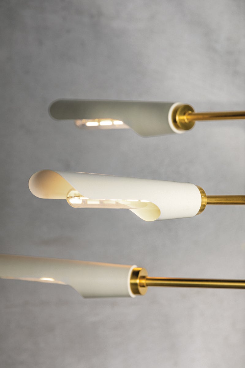 Sculptural and statement-making, Harperrose combines clean-line modernism with a playful touch. Recalling the clouds, this mobile-inspired design features an Aged Brass framework with shades in a Soft White finish. Mixing form with function, it directs light downwards, providing illumination over a large area. Available as a chandelier or wall sconce. Part of THELIFESTYLEDCO® collection.