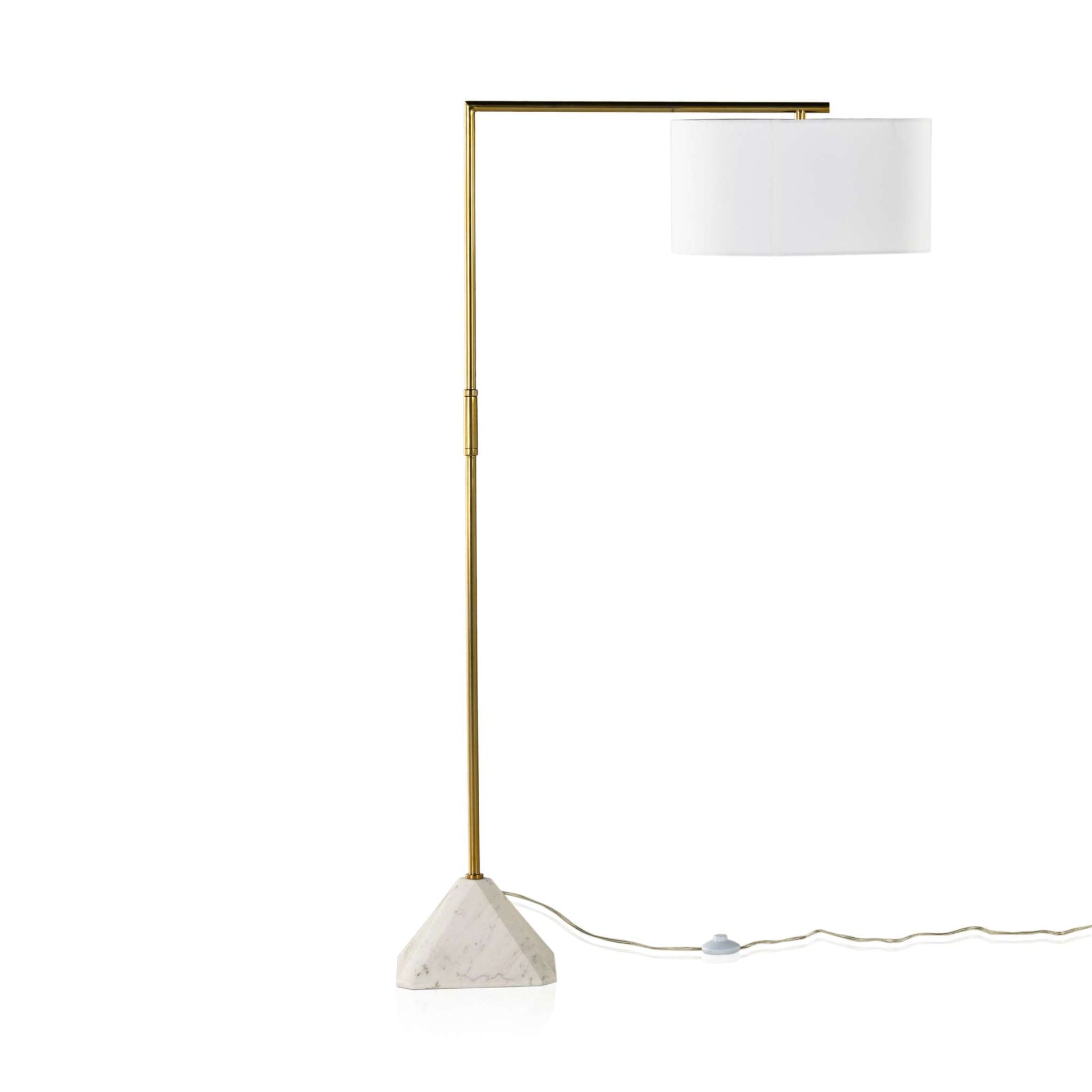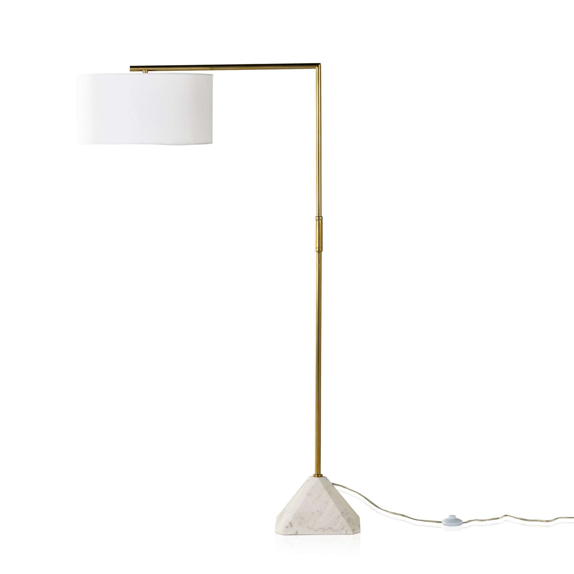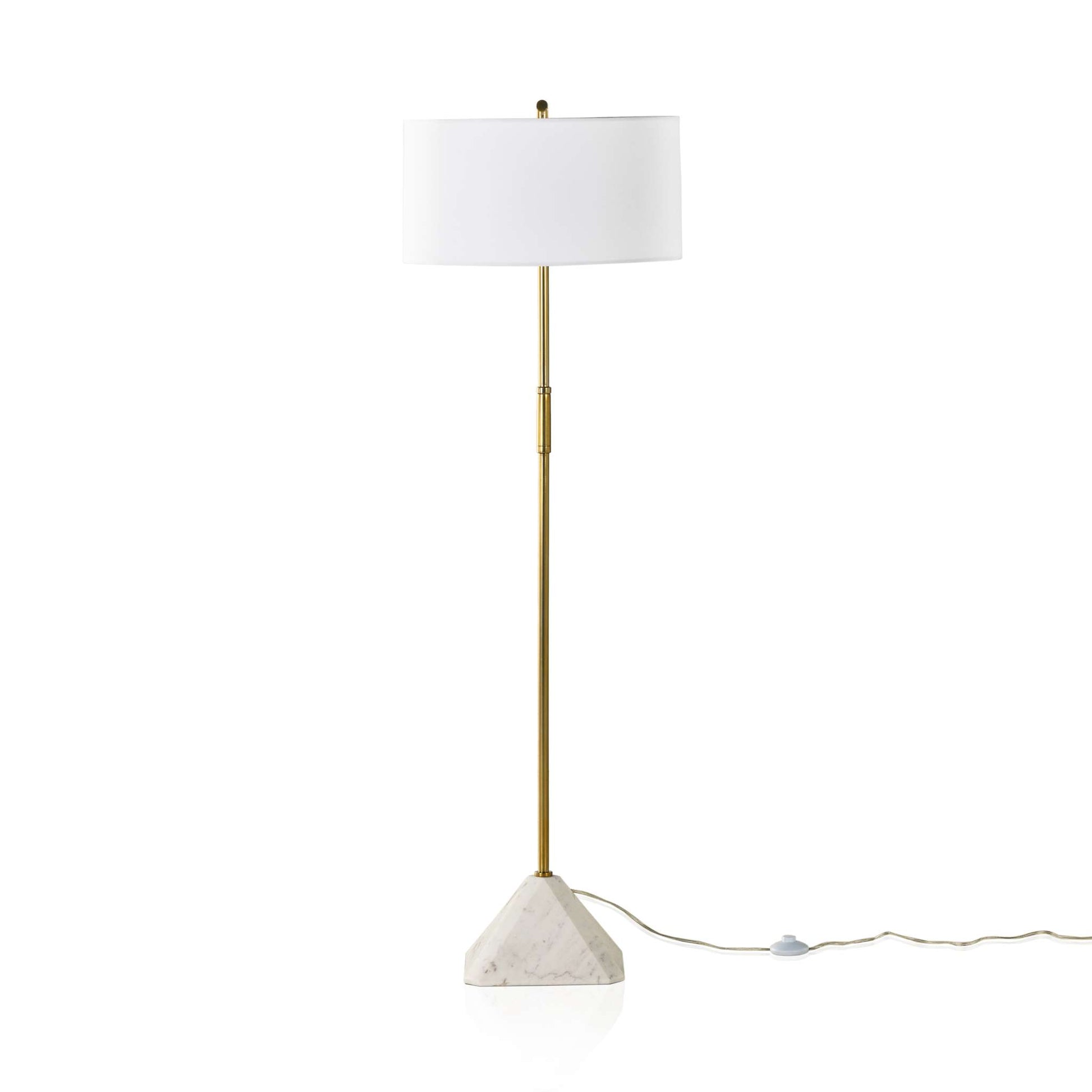 A pyramid-shaped white marble base and slim brass frame shine a spotlight on modernity.