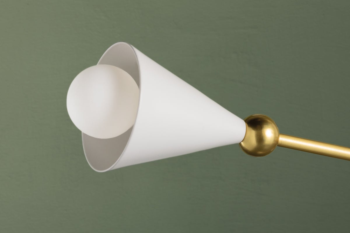 The flamboyant sputnik design of the Hikari chandelier bursts with confidence. Casting light in all directions, twelve soft white conical shades complete the Aged Brass satellite structure. Small spheres dot each arm like jewels, adding a decorative note to this mid-century modern revival. Hikari is also available as a wall sconce and a 4 or 6-light chandelier. Part of our Dabito x Mitzi Tastemakers collection.