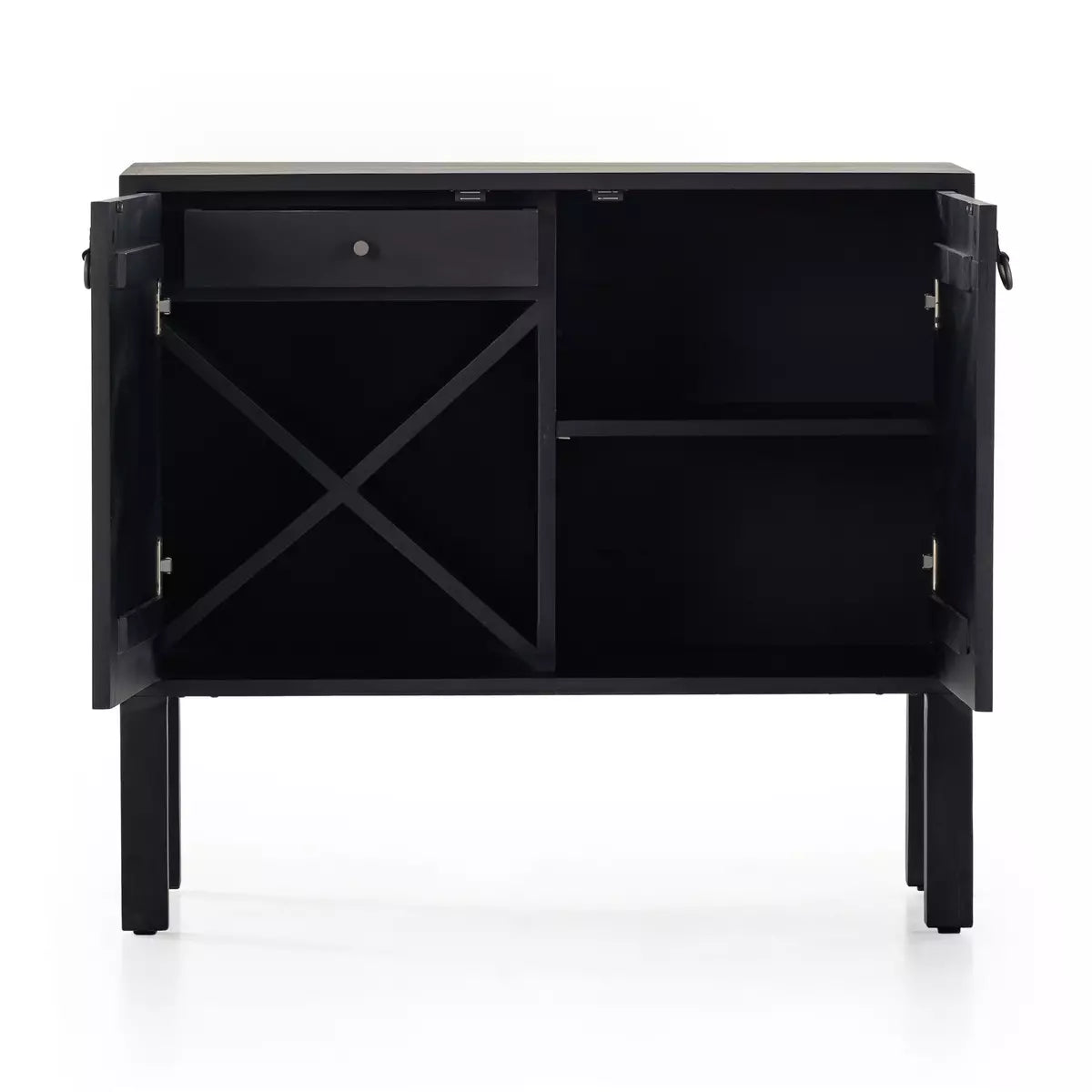 Beautifully simple in spirit. Black-washed solid poplar forms a Parsons-style bar cabinet, with iron and leather hardware for a material-driven update to Shaker-inspired styling. Inside, dual drawers plus generous bottle storage await drink go-tos and bar accessories.