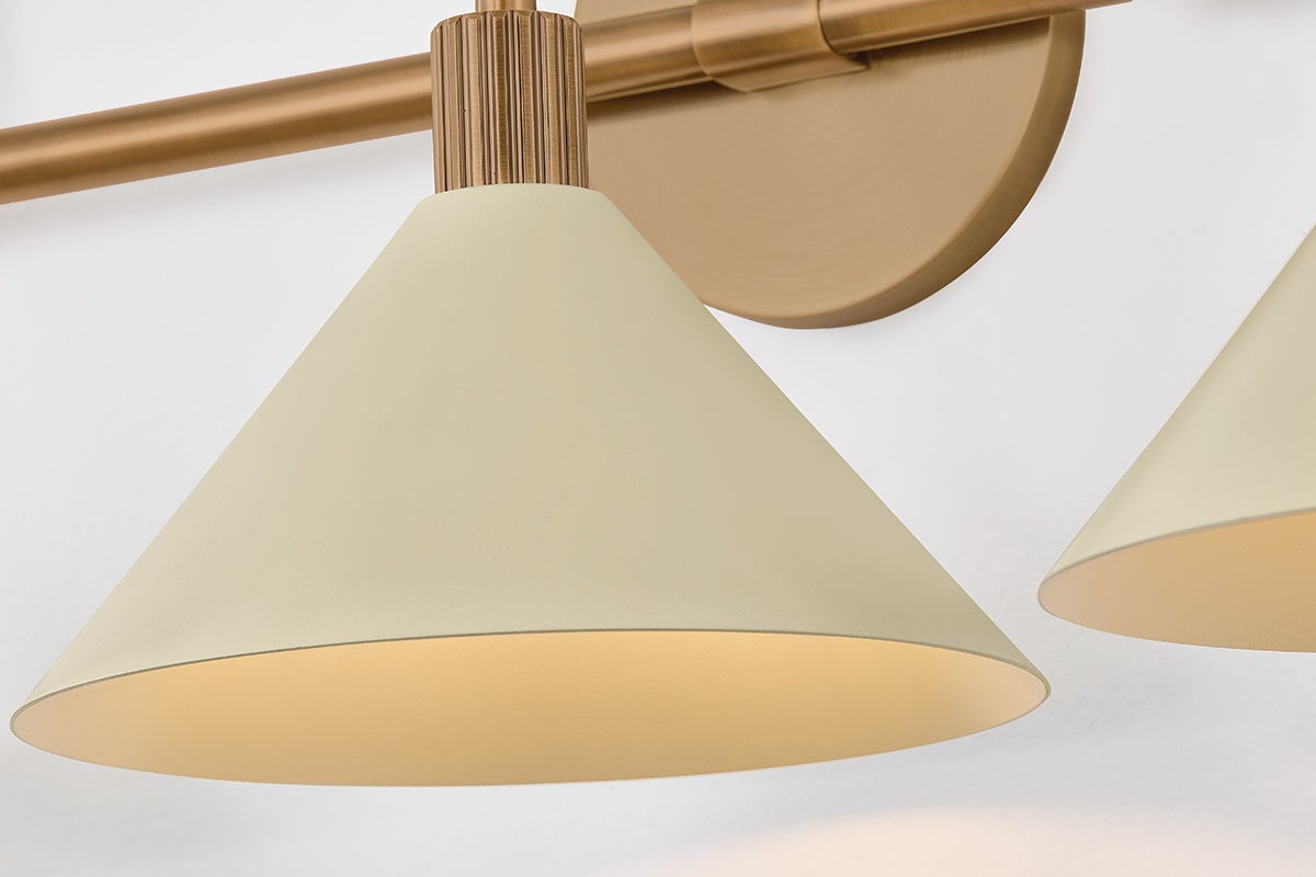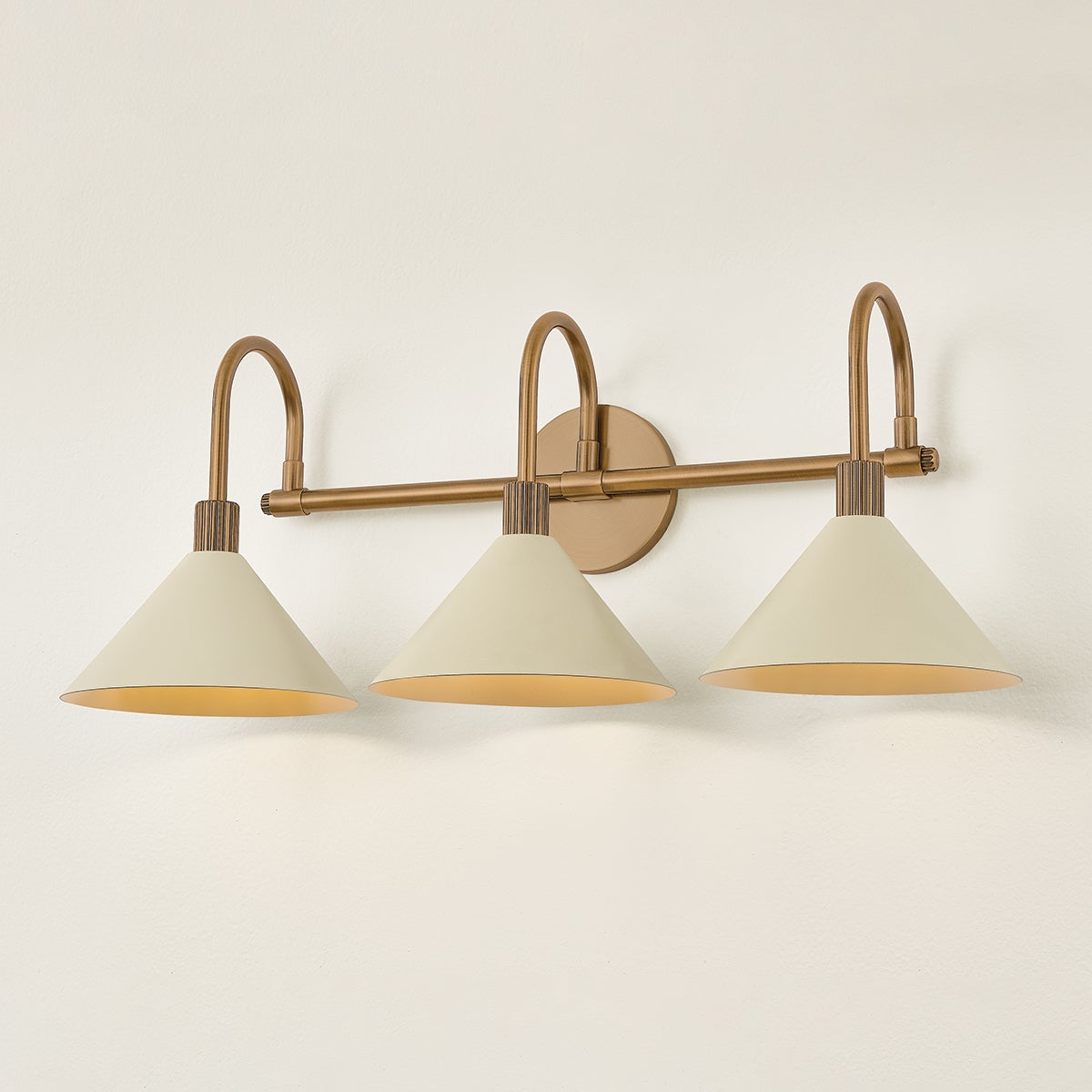 A modern interpretation of Art Deco shapes, the Jovani bath bar features elongated arms and sharply tapered Soft Sand shades. The clean design highlights the connections between elements through pronounced fittings and subtle fluting details. Finished in classic Patina Brass, Jovani is available with 1, 2, or 3 lights.