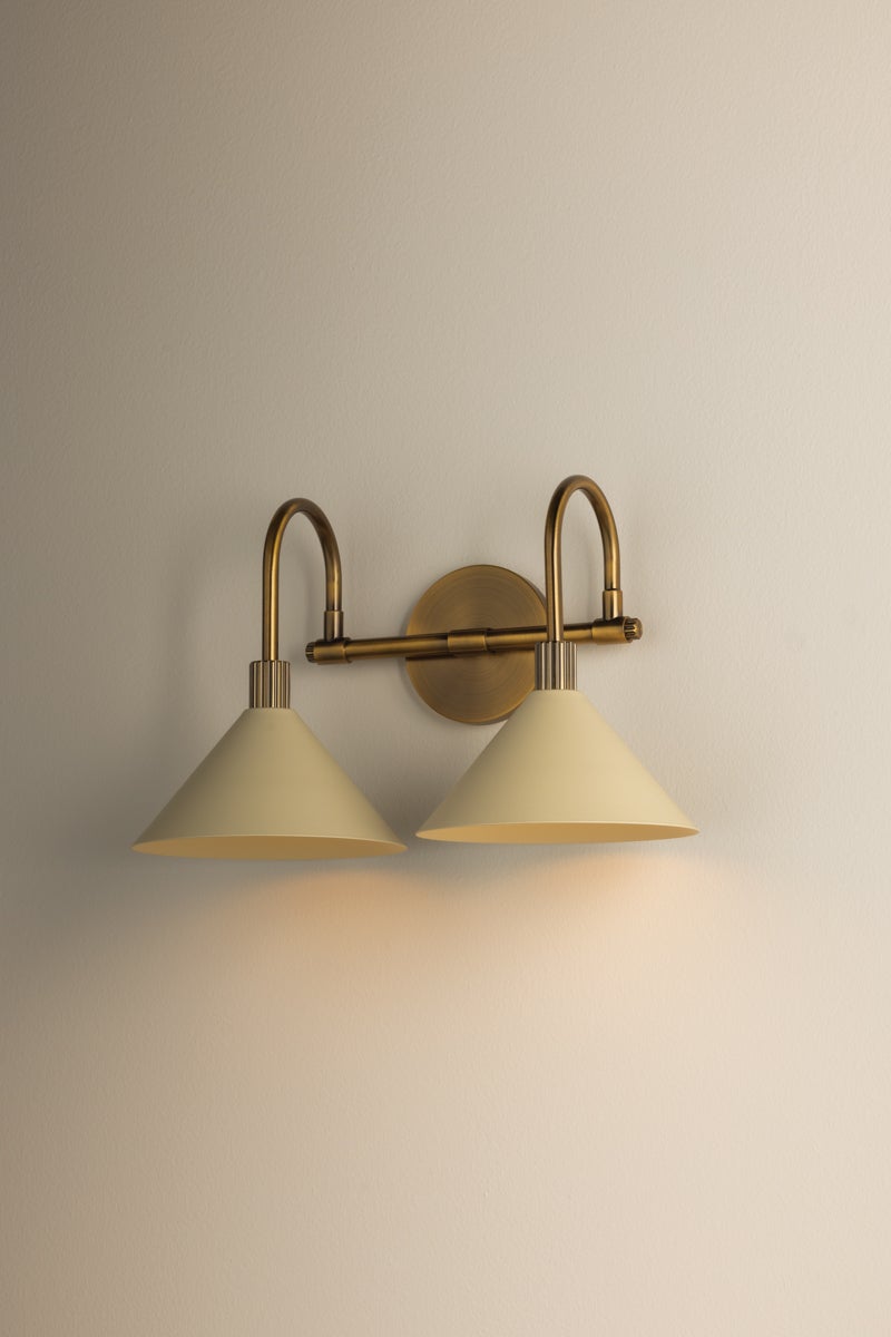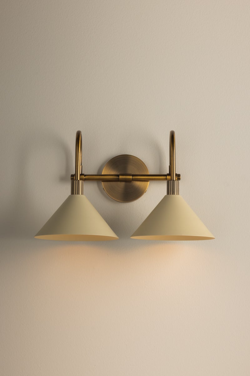 A modern interpretation of Art Deco shapes, the Jovani bath bar features elongated arms and sharply tapered Soft Sand shades. The clean design highlights the connections between elements through pronounced fittings and subtle fluting details. Finished in classic Patina Brass, Jovani is available with 1, 2, or 3 lights.