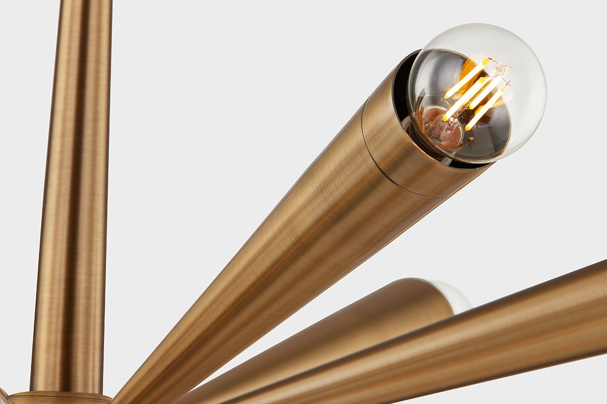 Keanu takes the very familiar sputnik design and makes it feel special. Slender, elongated cone-shaped shades in Patina Brass extend from a center orb giving the piece a vintage vibe that feels modern. The wall sconce casts both uplight and downlight, the flush mount adds gorgeous style close to the ceiling, and the chandelier's stunning silhouette comes in two sizes and casts a brilliant glow in every direction.