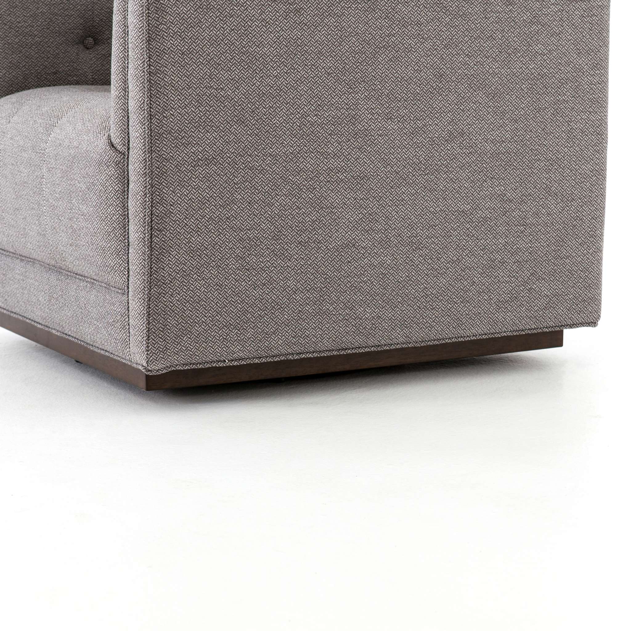 Grey upholstery covers clean-angled arms for a tailored look, with blind tufting for texture. A parawood 360-degree swivel modernizes this squared-off form.