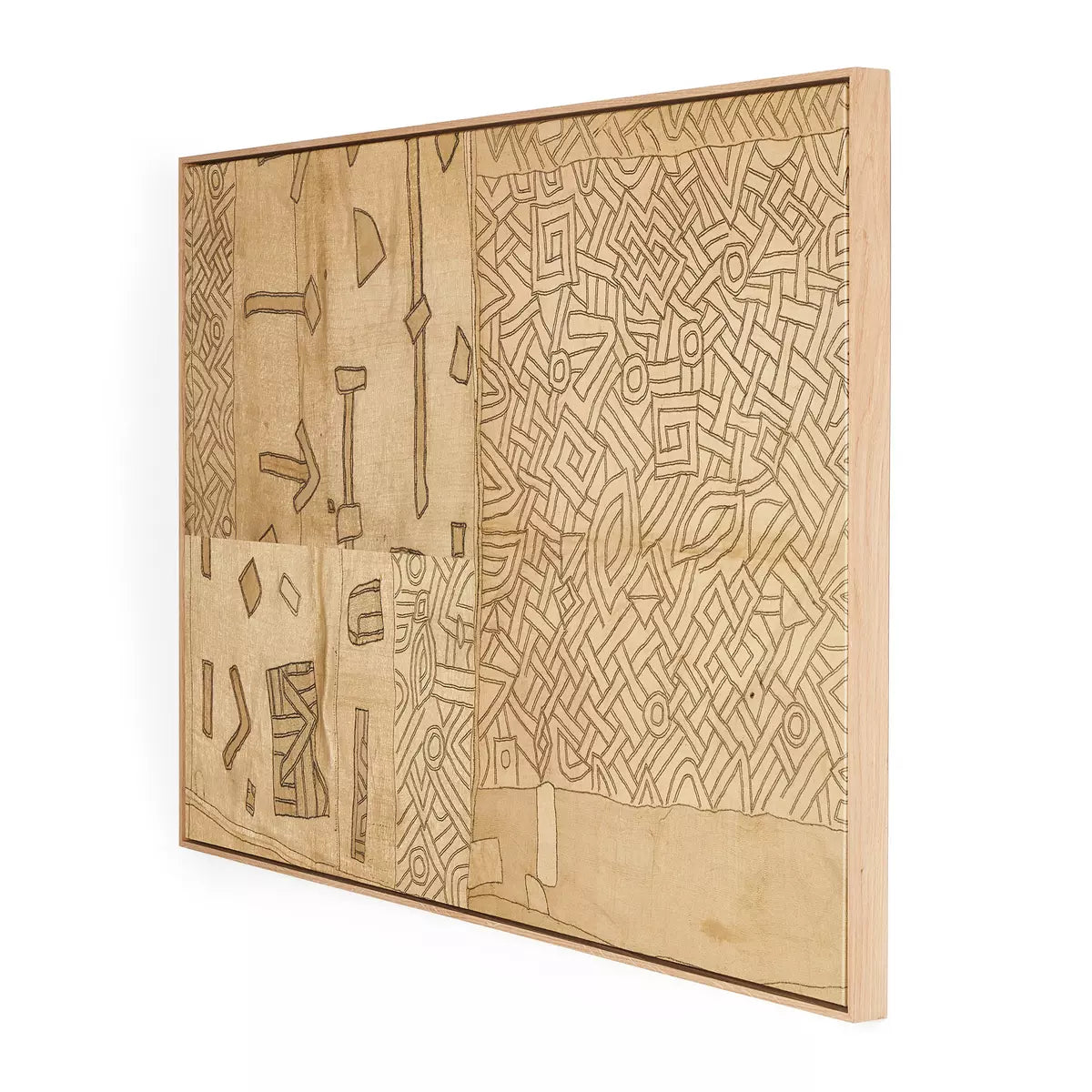 Inspired by authentic Kuba cloth, a traditional, handwoven raffia textile that originates from the Democratic Republic of the Congo and dates back to the 17th Century. Reproduced by scanning the original cloths and printing on matte canvas within a rustic walnut frame.