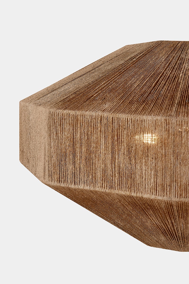 Designed to make an impact on large ceilings, Laken features a voluminous architectural shade. The artisanal jute-wrap technique gives the fixture its rich texture and warm color variance. Inside, a pinwheel cluster of lights emits powerful illumination. Laken is finished with Patina Brass metalwork, adding an antiqued quality that complements the rustic nature of the jute.