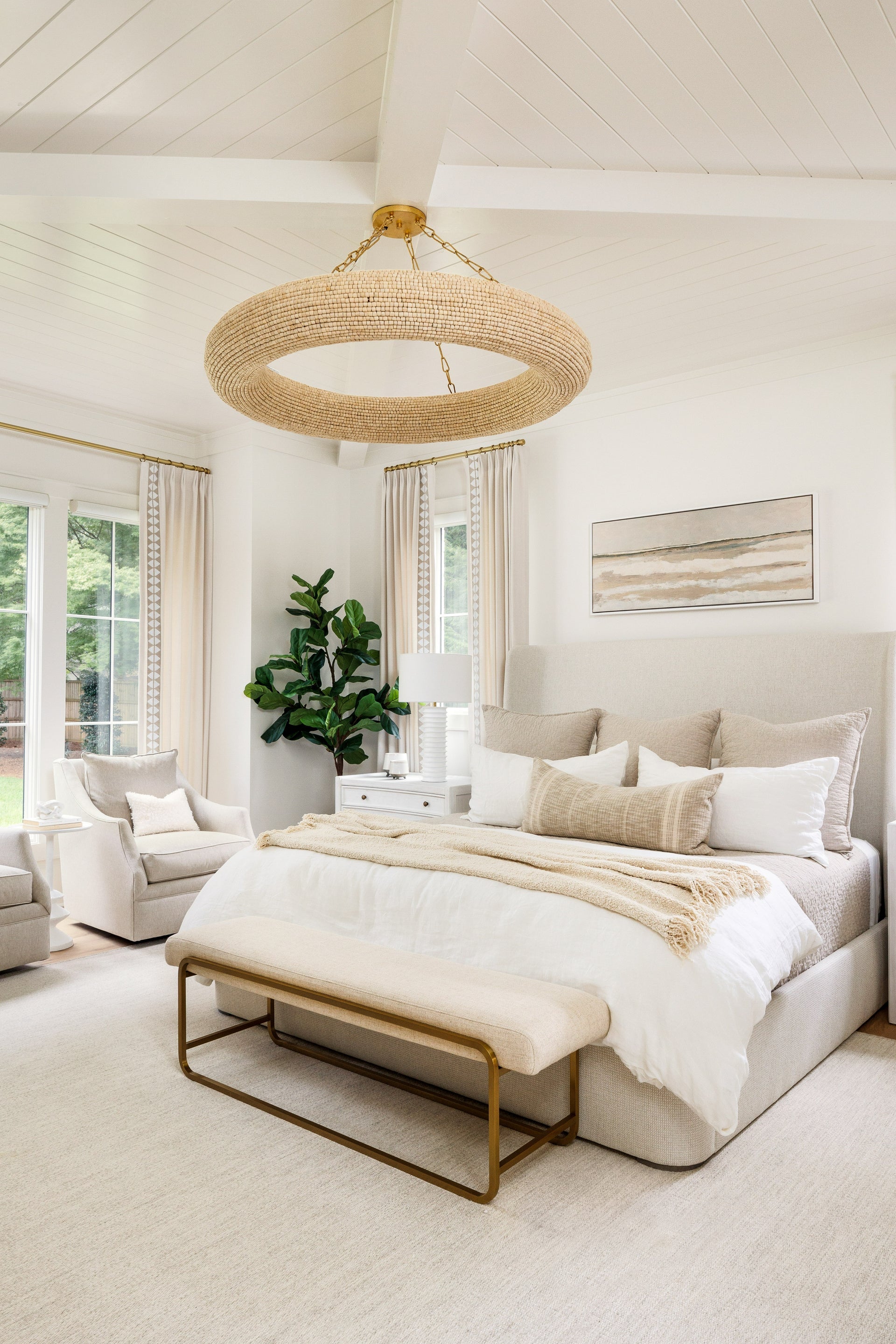 Inspired by the tropics, this large-scale chandelier exudes coastal elegance. The classic donut-shaped shade is adorned with hundreds of handmade wood beads in a light brown hue recalling sand and shells. Chunky Vintage Gold Leaf chains complete this bohemian-inspired chandelier, which comes in two sizes.