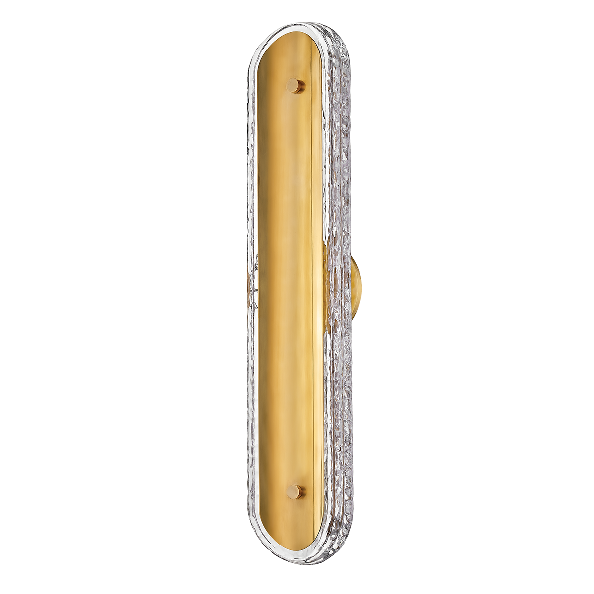 A smooth piece of convex metal is placed over a similarly shaped piece of clear textured glass. Light reflects off Macau's metalwork and flows down the step-like ridges in the glass filling the entire fixture with a sparkling, layered glow.