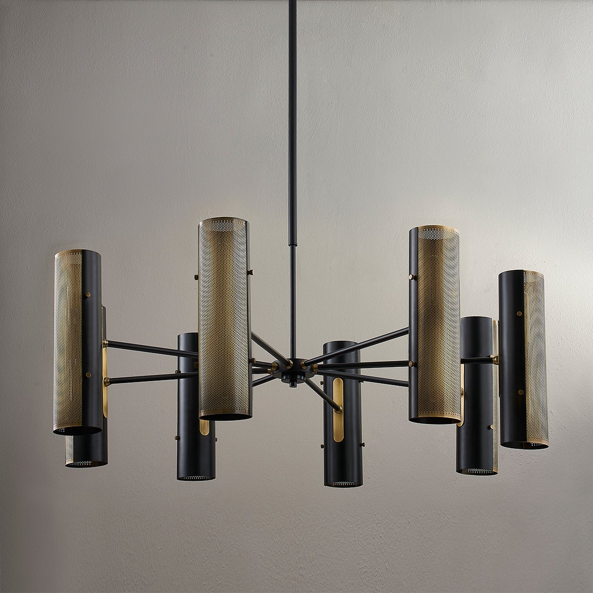 This modern and moody design features cylindrical, two-tones shades of perforated Patina Brass in the front and solid Soft Black in the back. Light shines through the perforated shade to create a dazzling display and exposed pins on the side add a subtle industrial feel. Lit or unlit, this design adds instant drama to any space.