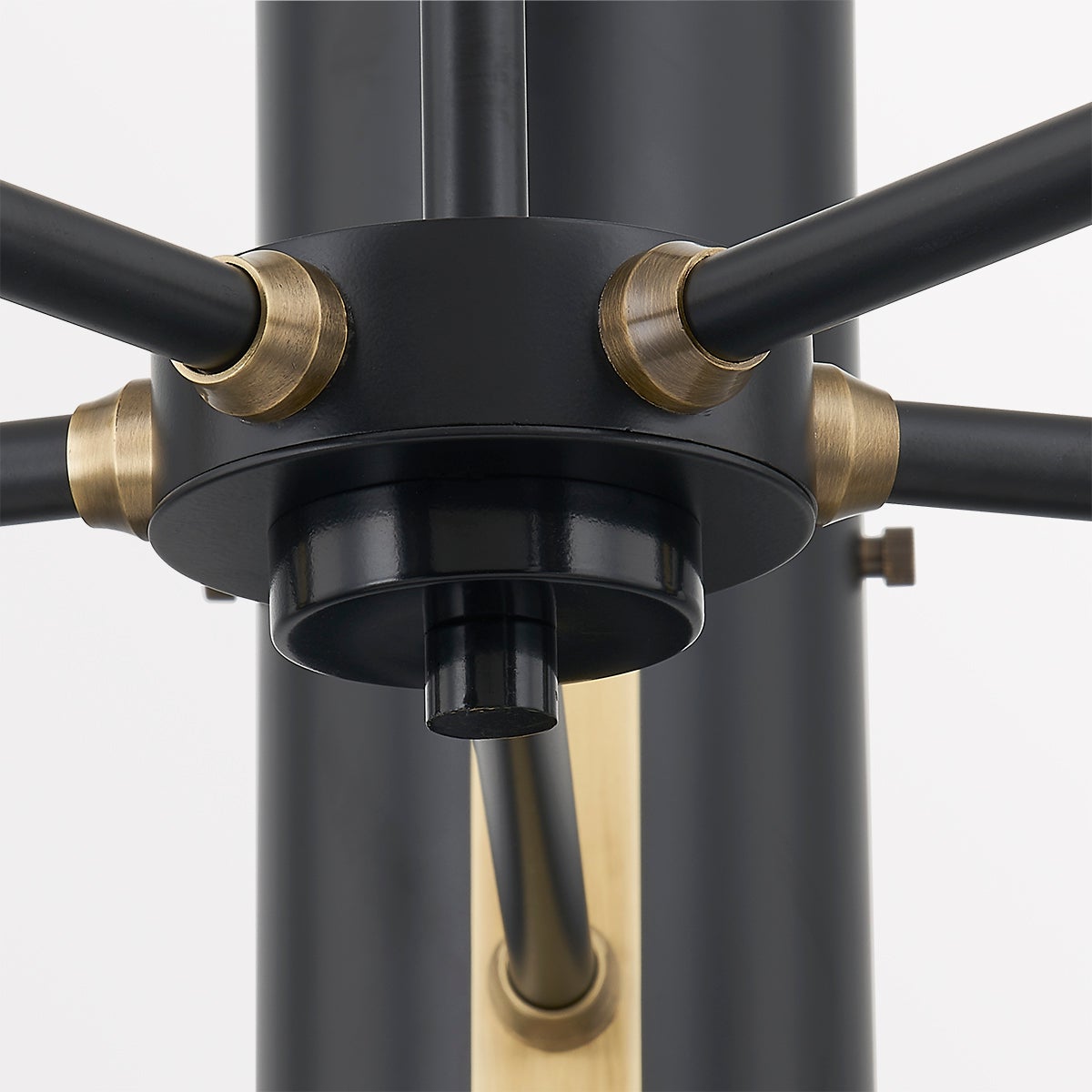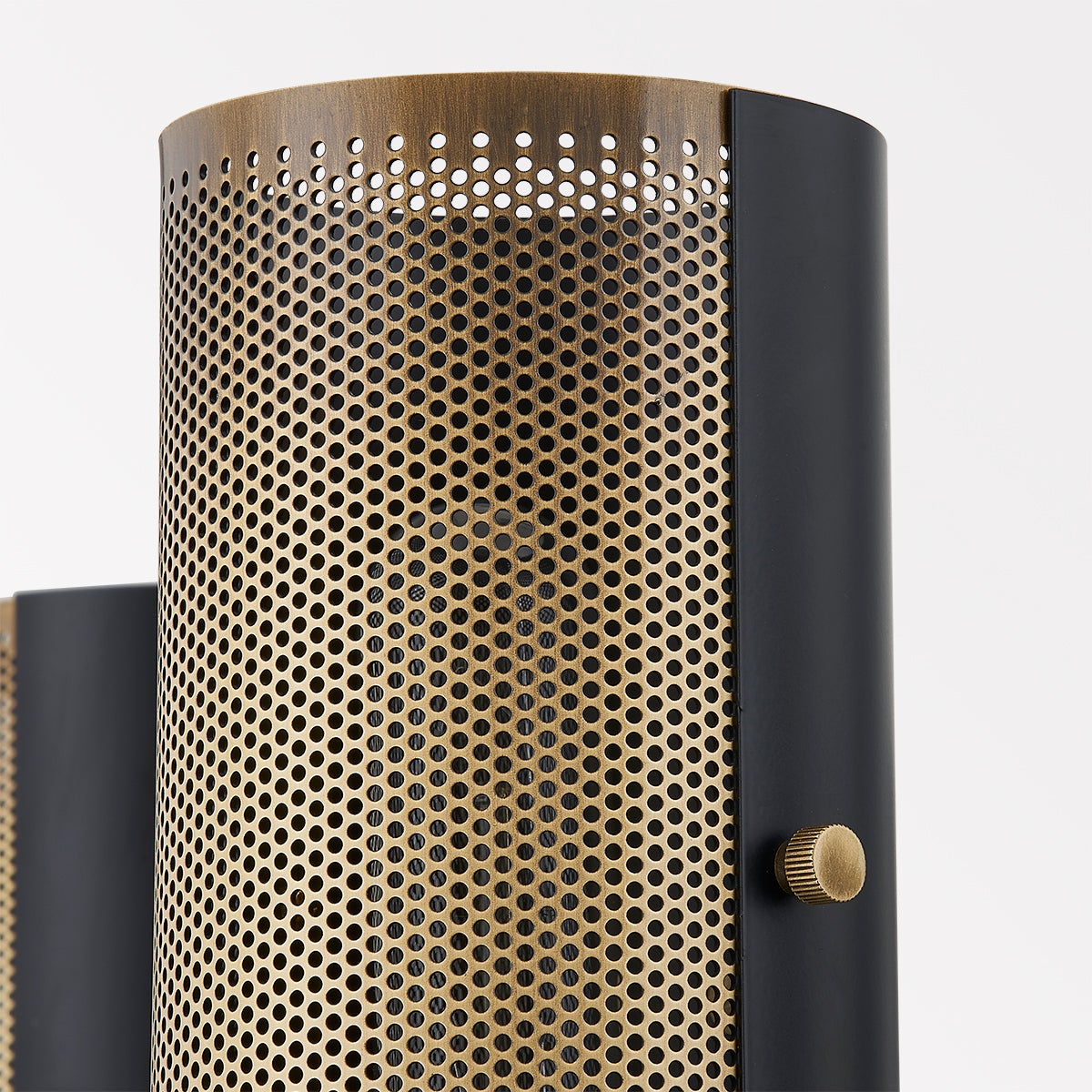 This modern and moody design features cylindrical, two-tones shades of perforated Patina Brass in the front and solid Soft Black in the back. Light shines through the perforated shade to create a dazzling display and exposed pins on the side add a subtle industrial feel. Lit or unlit, this design adds instant drama to any space.