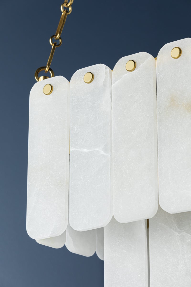 Inspired by Art Deco design, this grand chandelier features three tiers of lustrous cascading alabaster panels. Cool and milky when unlit, the subtly translucent alabaster comes to life with a warm glow when illuminated. Enhanced with Aged Brass finials and suspended from an elegant chain, Moissanite exudes an old-world sense of glamor. Choose between a 17 or 33-light option – both make a striking statement in an entryway or large living room.