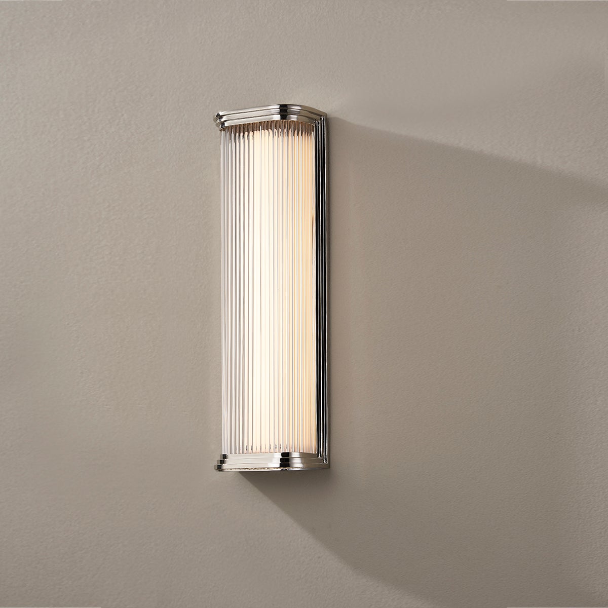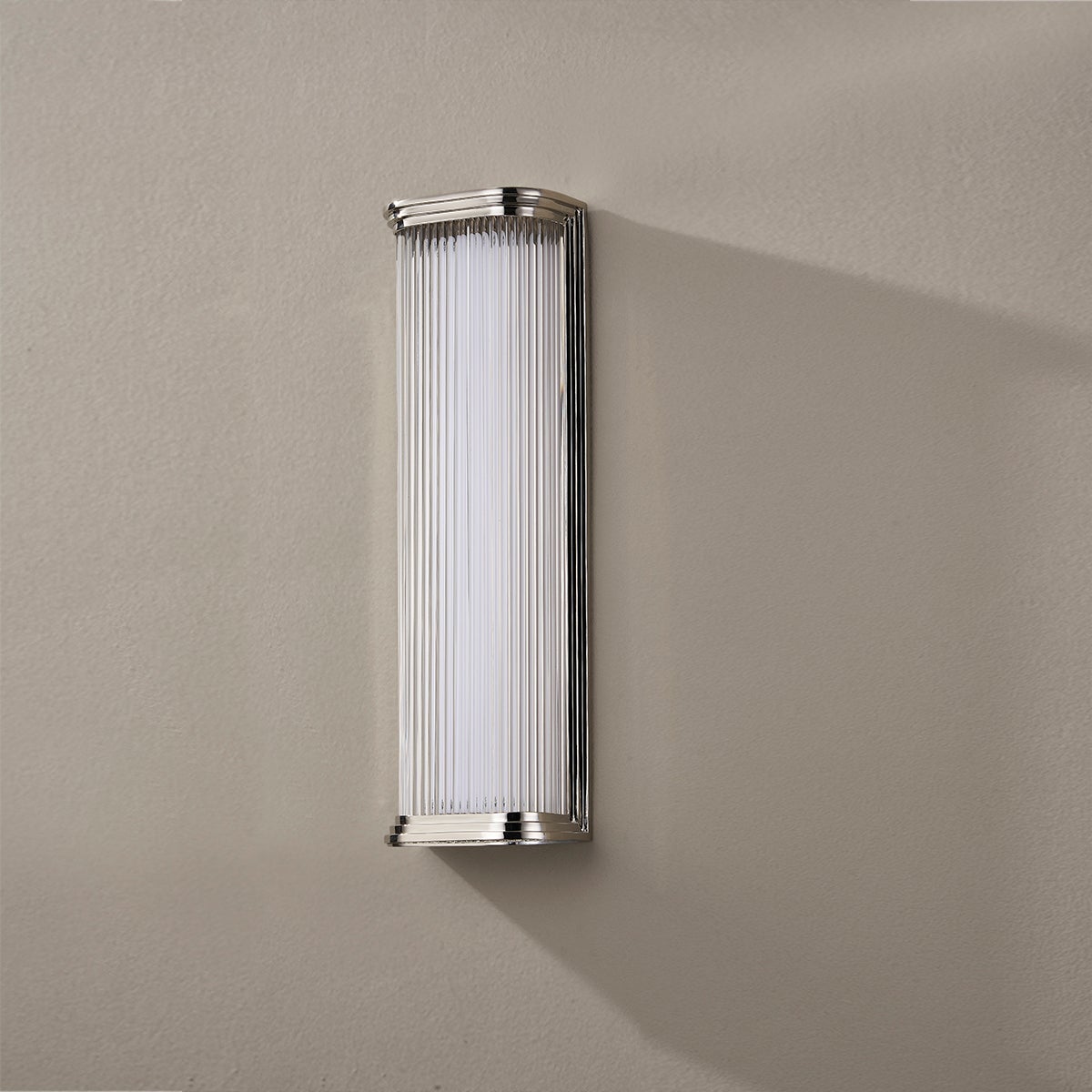 Newburgh gives new life to the classic glass rod sconce. A soft rectangular metal frame with stepped detailing holds clear glass rods that make up the shade of this art deco-influenced design. Available in two sizes and two finishes, Newburgh would work wonderfully in a bath or home theater setting.