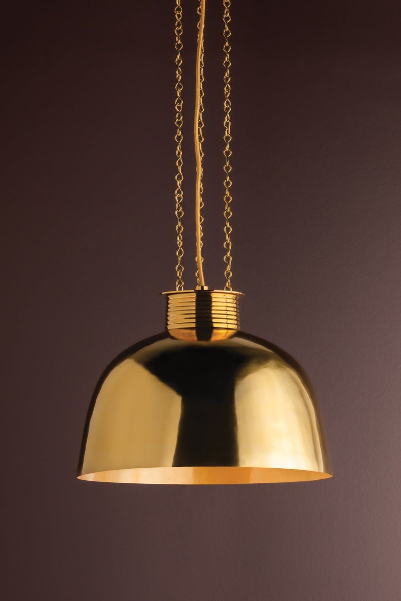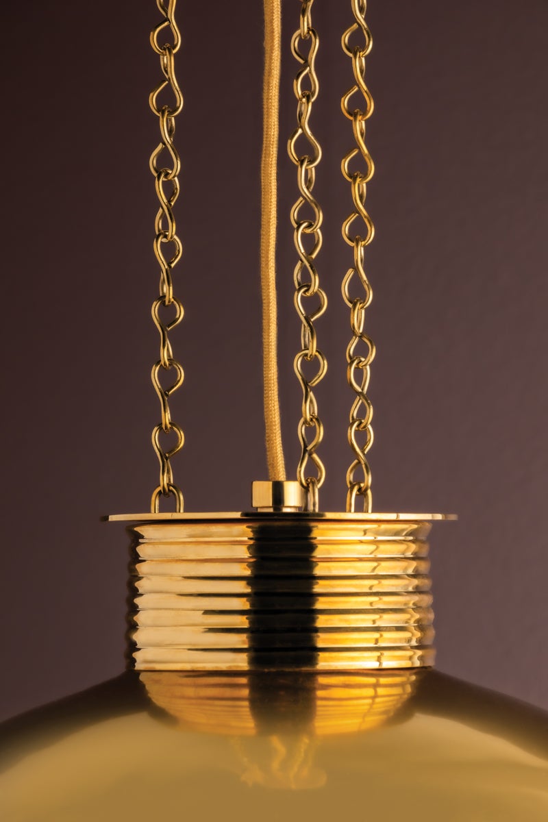 Suspended by three delicate decorative chains, this large-scale dome fixture is designed to bring refinement to everyday spaces. The allover Vintage Brass finish is refined and reflective, while the textured metal ‘bangle’ hardware gives the silhouette a jewelry-like feel. Available in two sizes, Perseus makes a bold, dynamic impression in modern spaces.