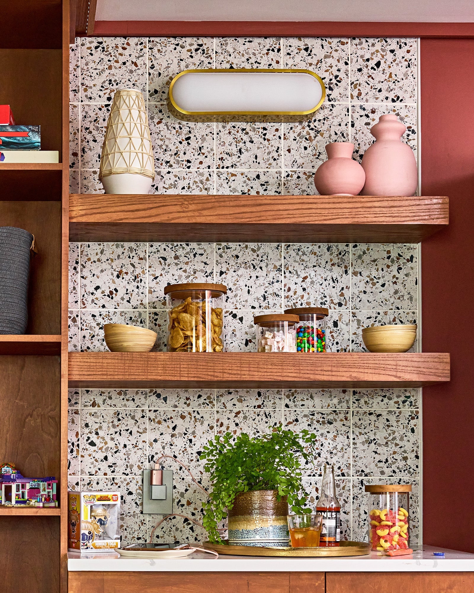 Whether in capsule-shaped sconces or pod-hatch-shaped flush mounts, Phoebe’s futuristic vibe is totally present with a pattern of square and rectangle perforations along its metal frame, which allow extra light ventilation from its sides.