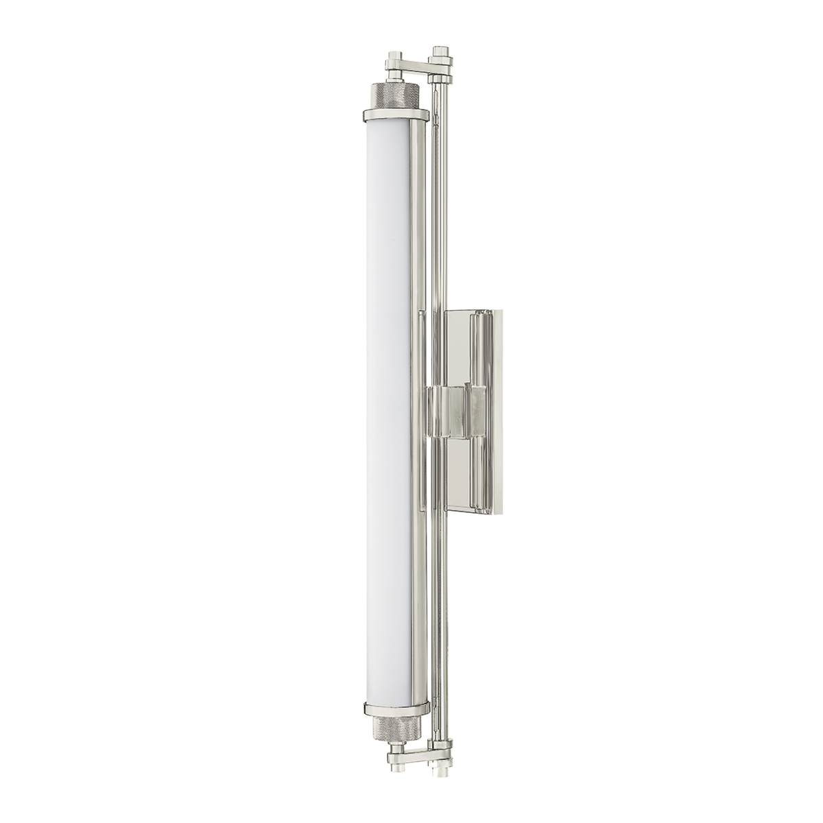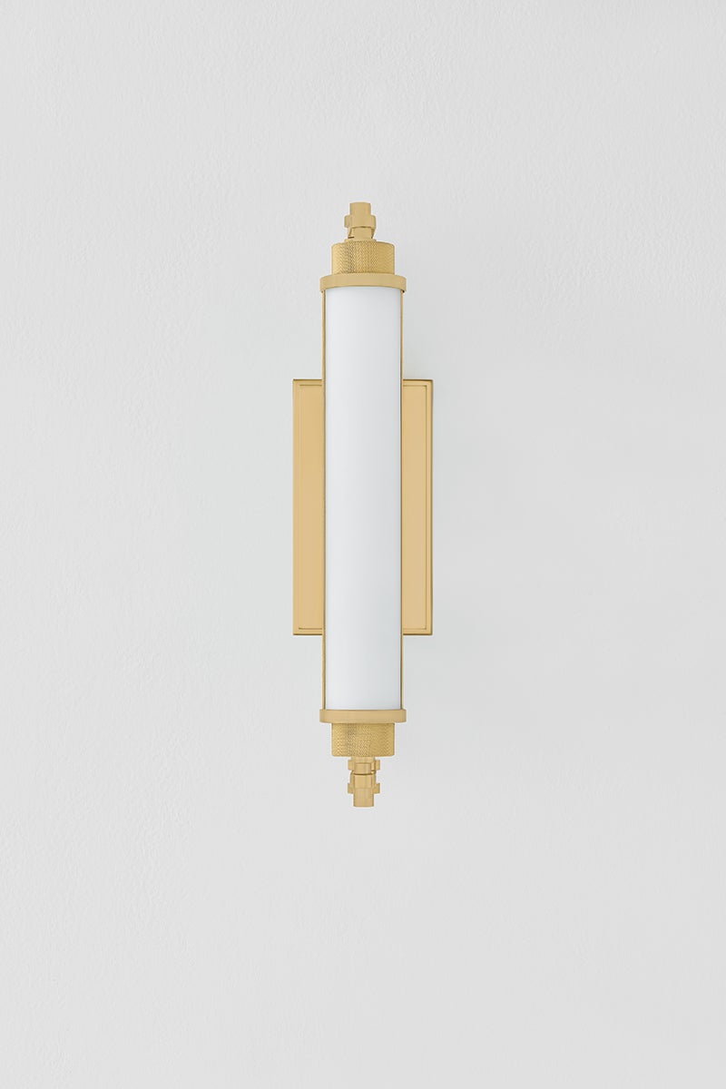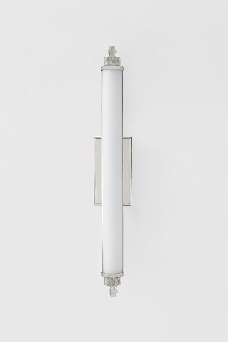 Designed for bath and powder rooms, Plandome is a sleek, machine-inspired sconce with high functionality. Featuring a single LED-lit opal matte glass tube supported by a central stem, this slender fixture can be used individually or in multiples as needed. Finished in Aged Brass or Polished Nickel, the metalwork adds a stylish quality to a thoroughly modern sconce. Available in two sizes.