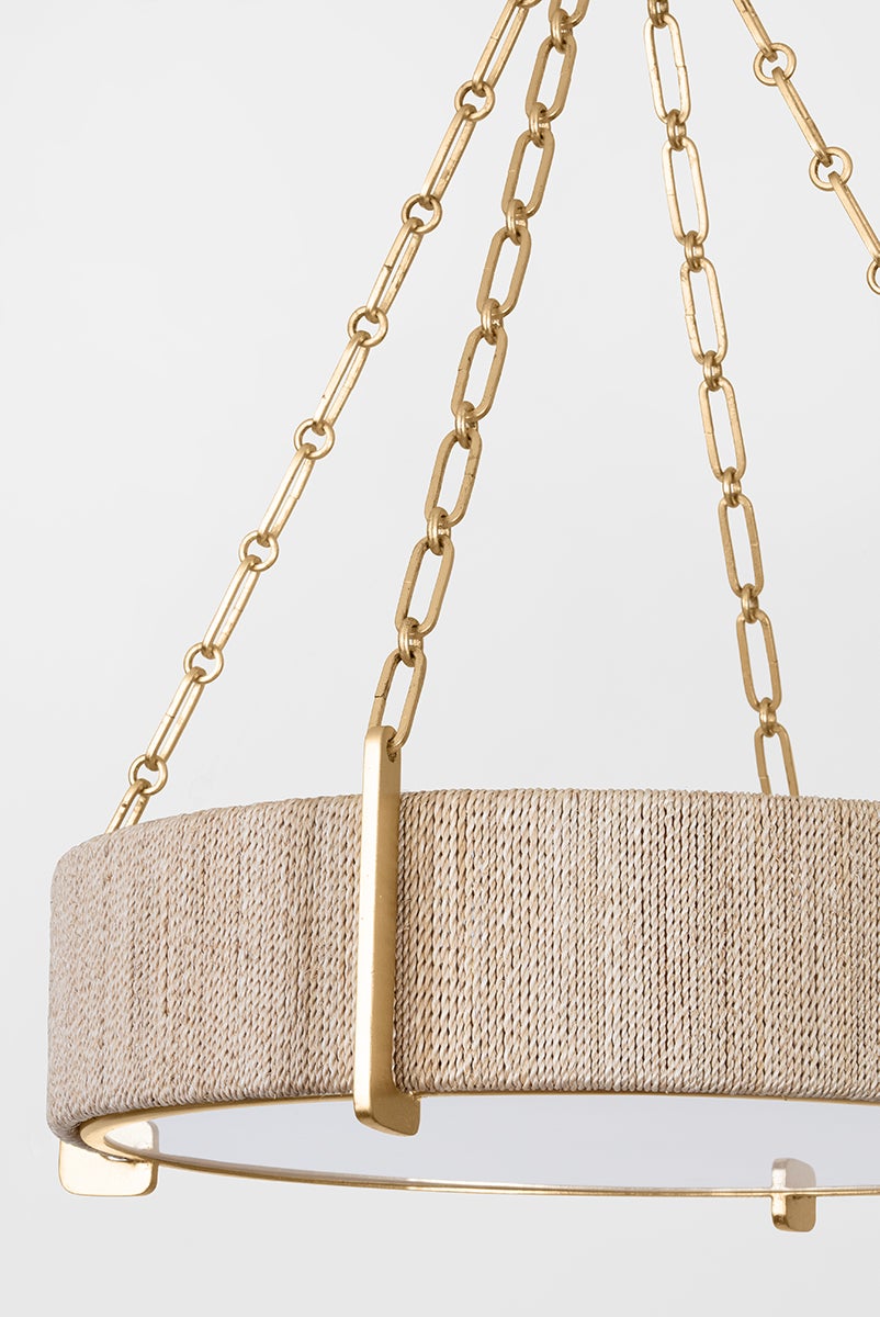 In a clever play on materiality, this sensory fixture transforms bleached Abaca rope into jewelry-like chains. The finely twisted ropes appear like delicate gold strands from afar but have a rustic quality that makes the fixture feel casual and coastal. Suspended by a thick Gold Leaf framework, Quebec is available in two sizes of chandelier as well as a sconce. The clear glass drum has been painted white for a soft, opaque effect that gently diffuses light.