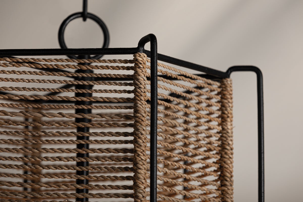 A textured black framework is wrapped in natural jute on the interior to create a modern industrial style that looks rustic yet elevated. The metal frame is vertical and the rope detail runs horizontal forming a dynamic silhouette that feels fresh. The lantern is available in three different sizes to suit any space.