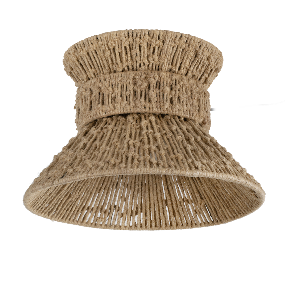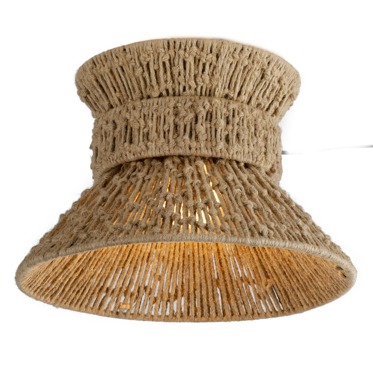 Crafted with a hand-knotted jute string technique, the designs of the Raphael family are like artful ornaments. Each fixture has a central cuff that cinches the conical shades, giving them their distinctive shapes. A hidden bulb radiates light through the gaps in the weave, creating a warm and welcoming glow. For added cohesion, the pendants feature a decorative string-wrapped loop that connects to a Patina Brass chain.