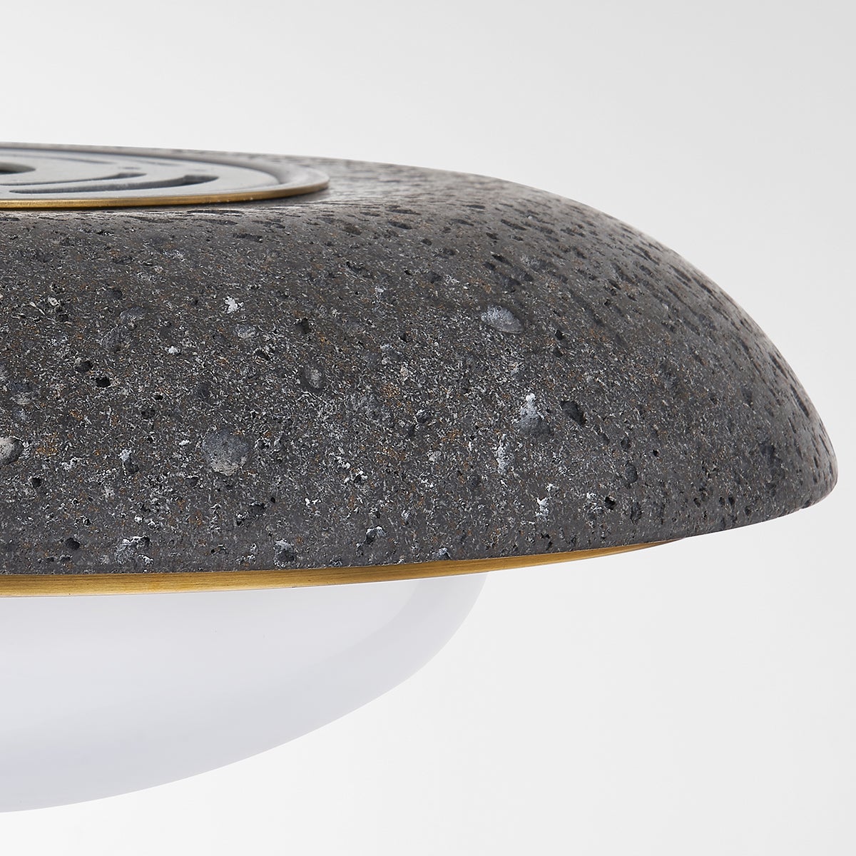 Rocklin is functional wall art. A Black Lava Stone bowl with a Patina Brass inlay and opal glossy glass globe combine to make a graphic statement that is both organic and chic. The porous lava stone gives the fixture a sense of openness and picks up the light beautifully.