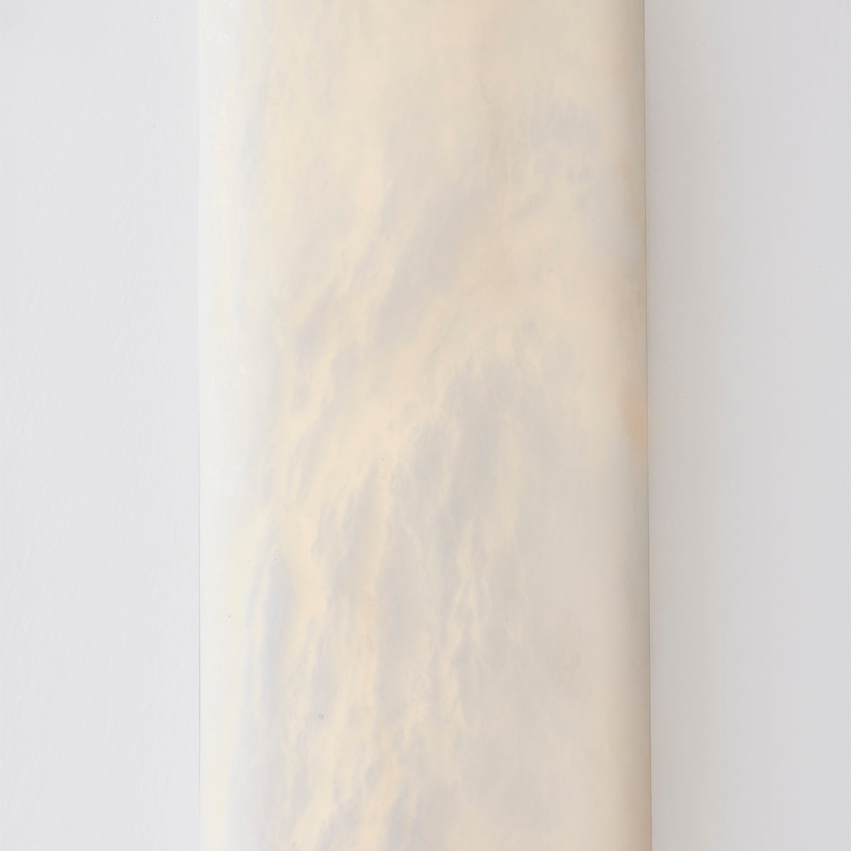 A straightforward sconce design allows the natural beauty of alabaster to shine. The smooth, curved Aged Brass holder puts a cylindrical alabaster shade on display. Lit from within by an LED, it casts a soft glow that highlights the veining in the stone. This versatile and stylish wall sconce can be hung alone or in multiples to bring a simple elegance anywhere in the home.