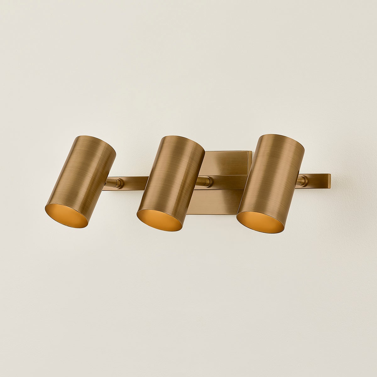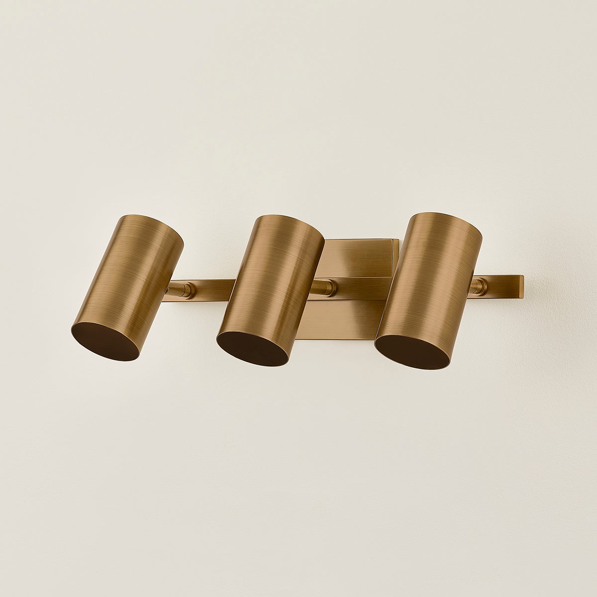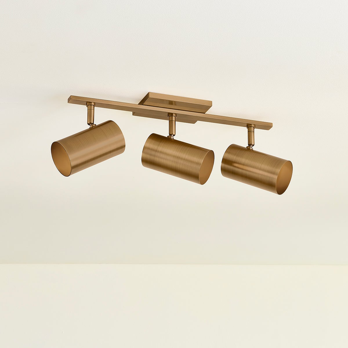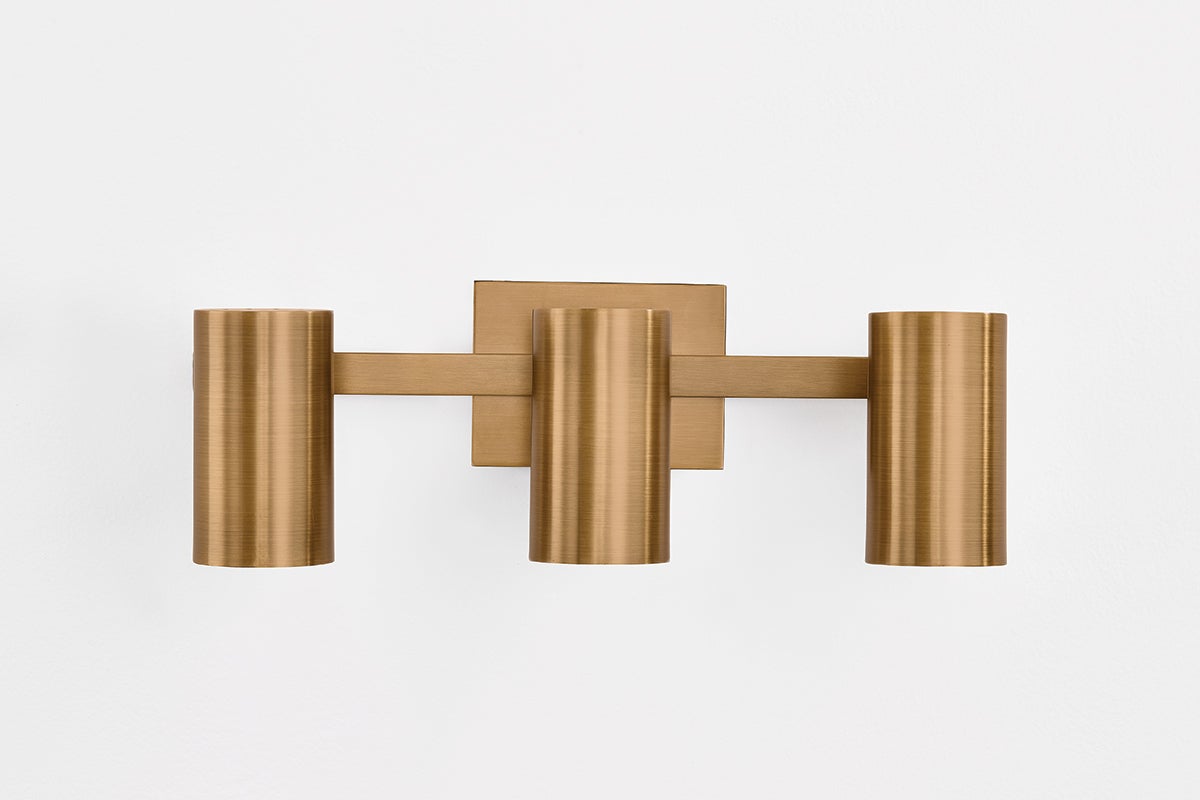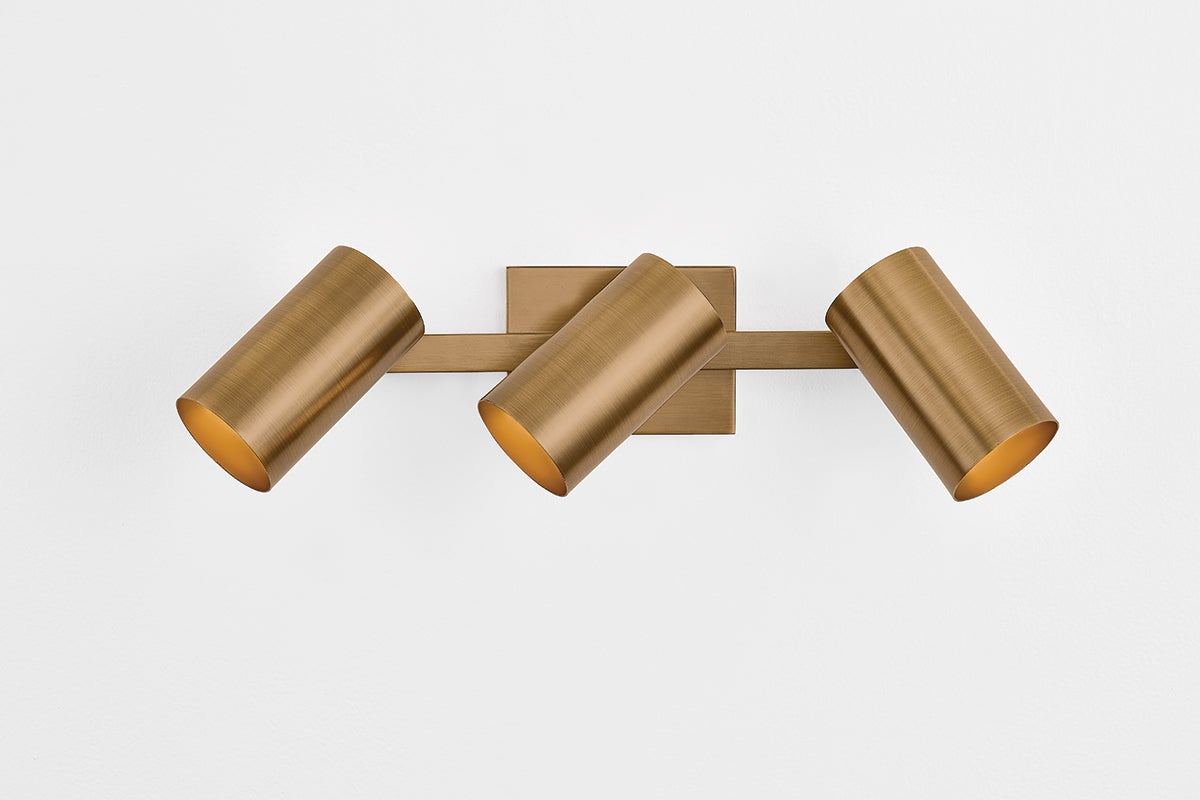 A sleek track light with a modern edge, Rueben is designed for a modern bathroom. Befitting mid-century style homes, the industrial-inspired silhouette incorporates right angles and conical shades. Articulating heads allow for precise directional positioning as needed. Rueben comes with 2 or 3 lights and a choice between Patina Brass and Bronze finishes.