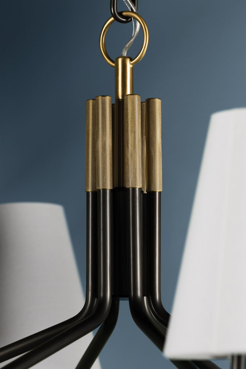 Inspired by a chandelier from the 1930s, the Stanwyck wall sconce and chandelier take traditional elements, like the arm shape and tapered shades, and updates them with a fresh material combination and machined details. Slender Distressed Bronze arms, accented with Aged Brass caps and knurled bands, swing up at the end to hold white linen shades. The chandelier has a beautiful hook-and-ring detail and the shades are mounted off-center, adding more visual interest to this modern design.
