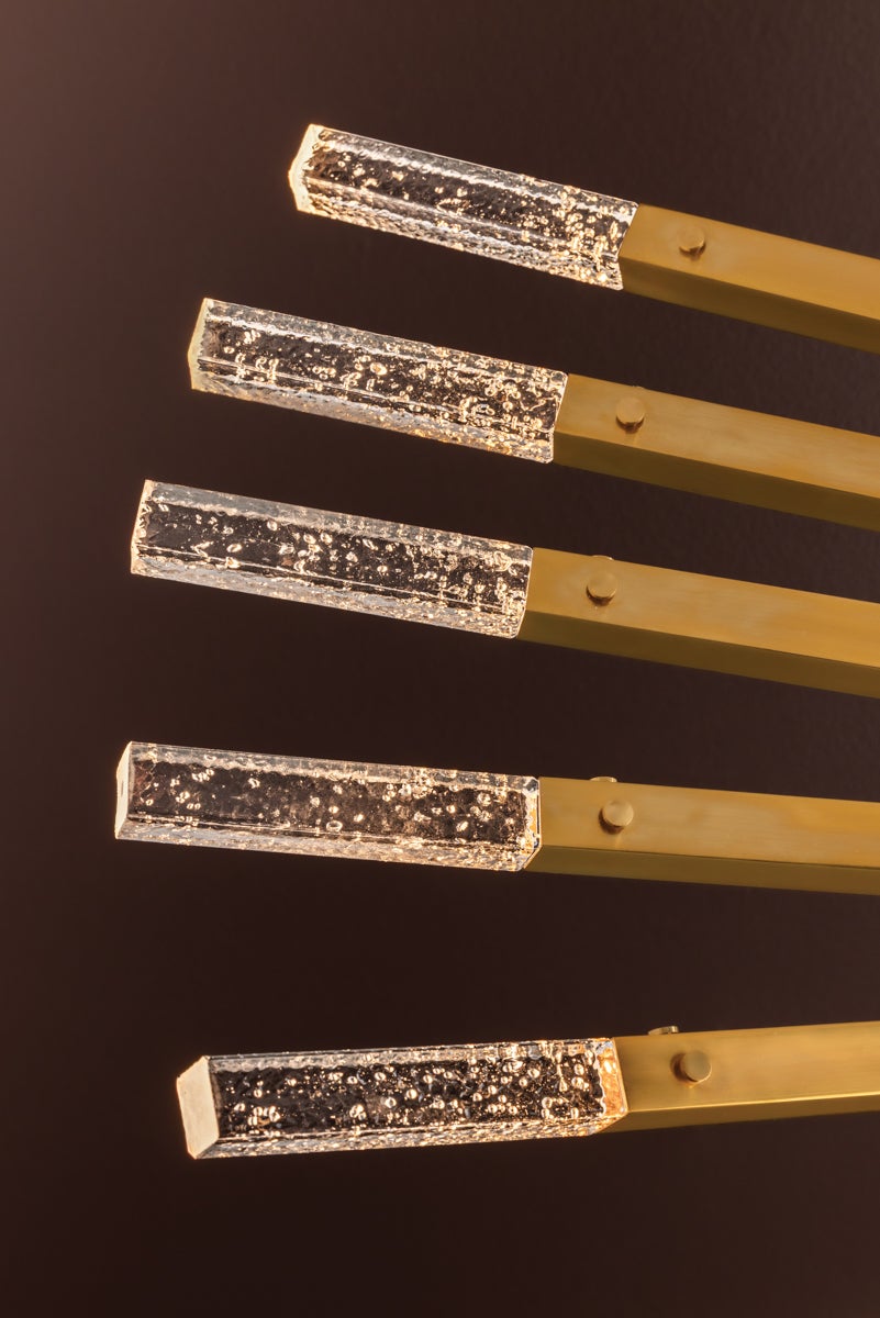 Bold and architectural, the Strasbourg family gives Art Deco style a modern twist. Available in two sizes, the chandelier features a fanned silhouette that forms a dynamic, artistic statement overhead. Finished in Vintage Brass, each arm is capped on both ends by a cast-seeded glass optic, creating an even spread of light that extends in all directions. The sconce shares the same edgy design language in a more compact, restrained form.