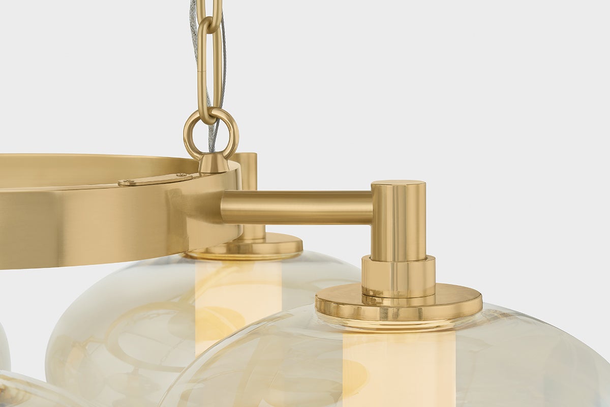 Drawing influence from the modernist era, Toulouse features sleek LED tubes surrounded by stacked oval-shaped glass orbs. The moody light bronze glass shades create bubble-like stacks, separated by Vintage Brass cuffs. Available as a sconce and a chandelier in two sizes, Toulouse is perfect for those who appreciate maximalist style with a contemporary twist.